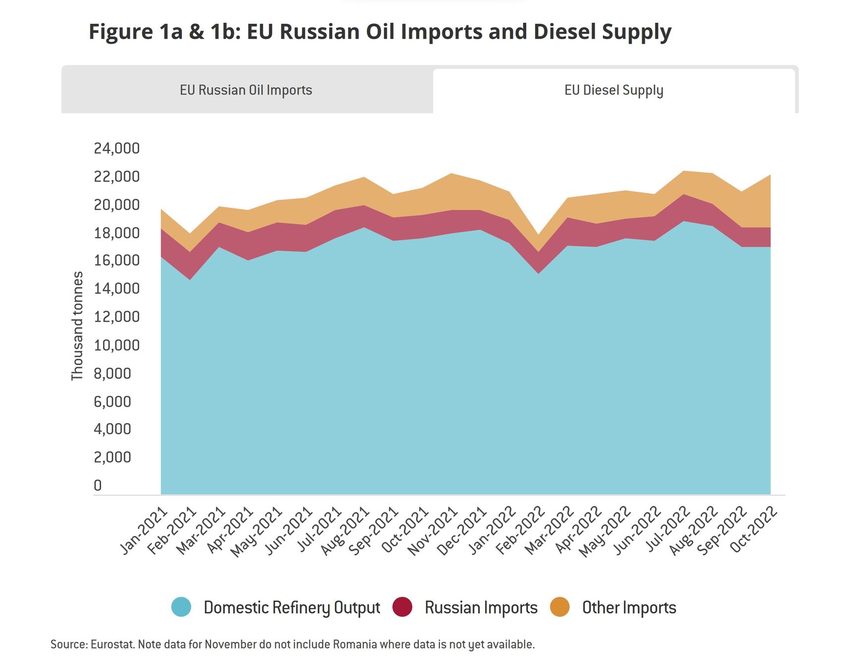 По информации европейского исследовательского центра Bruegel, потребление дизельного топлива в ЕС было на уровне 20–22 млн тонн в месяц, причем импорт из России составлял 8% от этого количества (80% потребляемого топлива производят в самом ЕС). Таким образом, до введенного в феврале 2023 года эмбарго Россия поставляла в страны ЕС 1,6–1,76 млн тонн дизельного топлива в месяц.