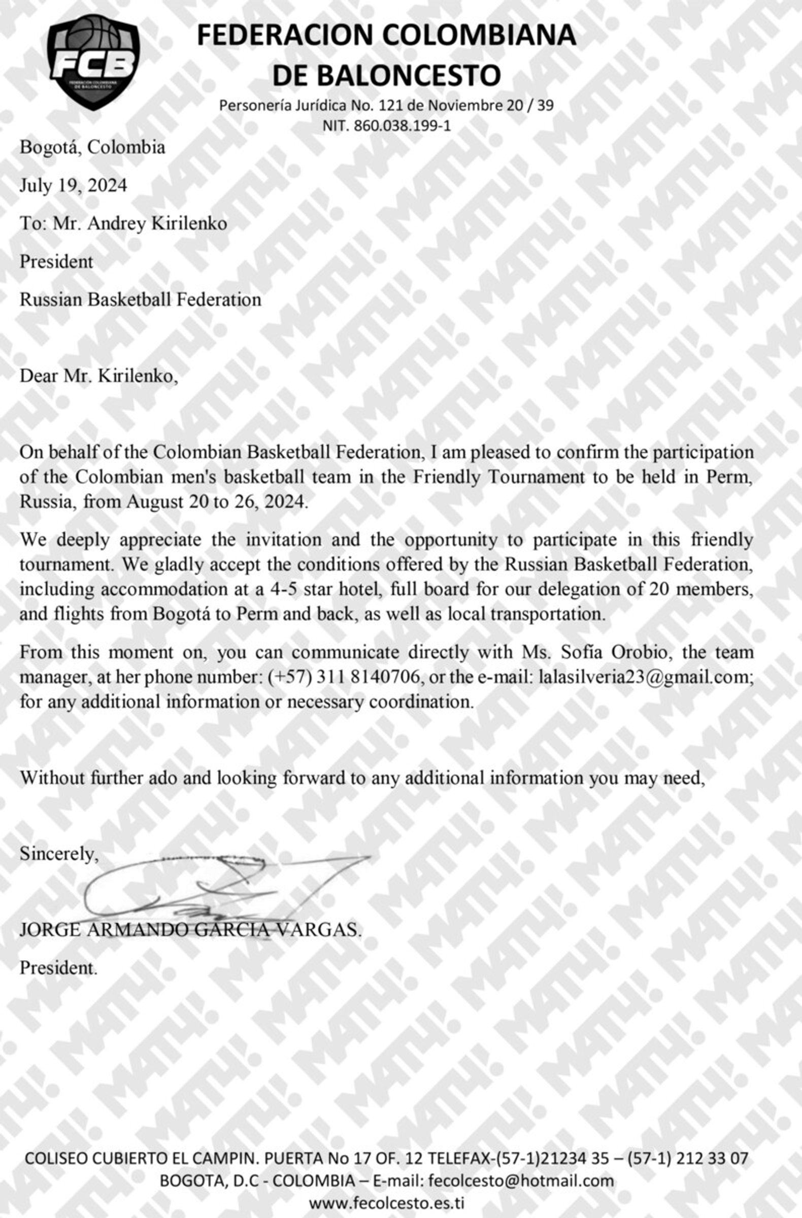 «Матч с участием команды, заявленной как сборная Колумбии, был организован в полном соответствии с официальными документами и подтверждениями. Все коммуникации и взаимодействия с Федерацией баскетбола Колумбии осуществлялись через официальные каналы, что исключает какие-либо сомнения в легитимности участия данной команды в турнире».