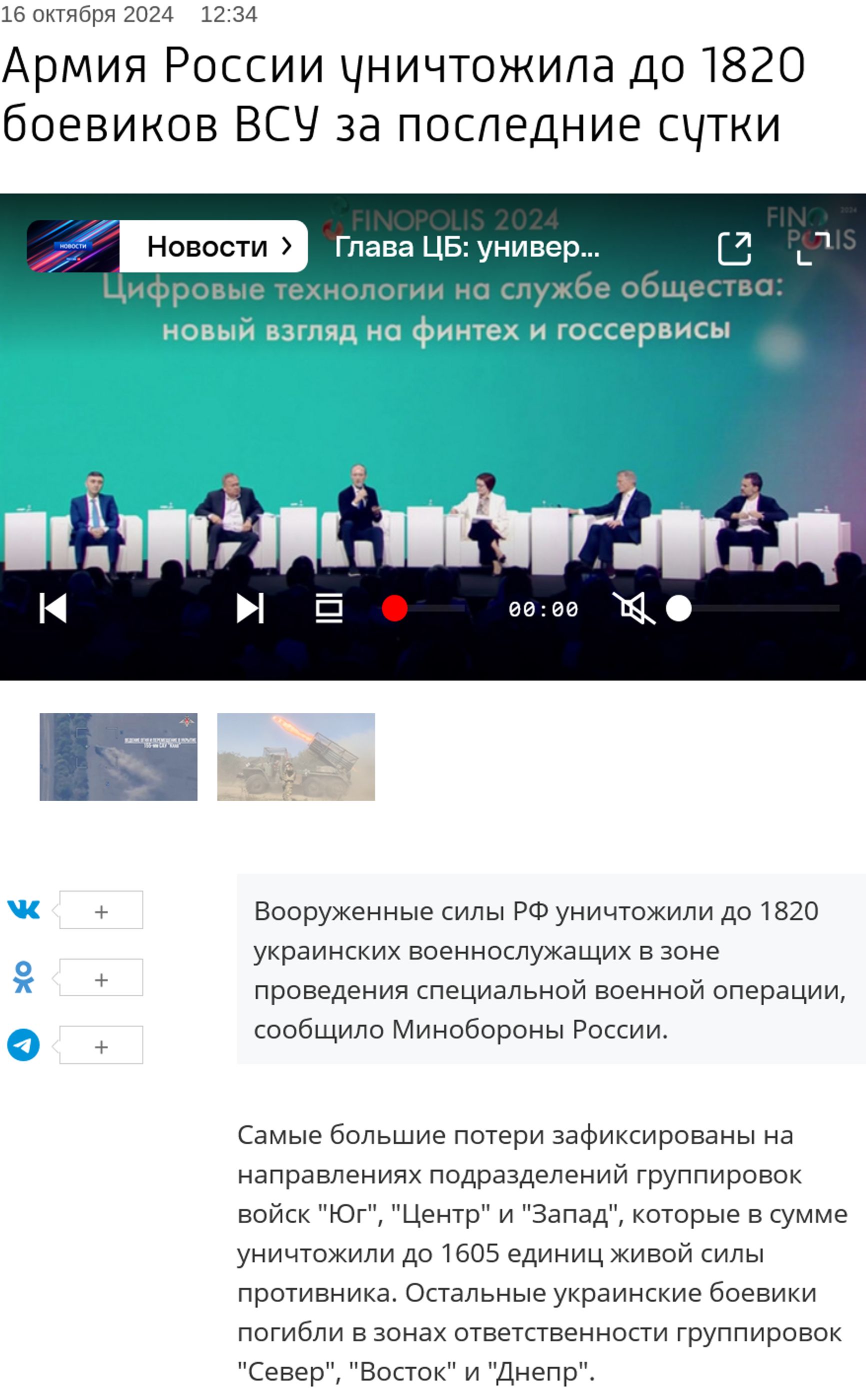 Впрочем, «Вести», ссылаясь на Минобороны РФ, 16 октября сообщили, что за одни только последние сутки ВСУ потеряли убитыми 1820 бойцов.