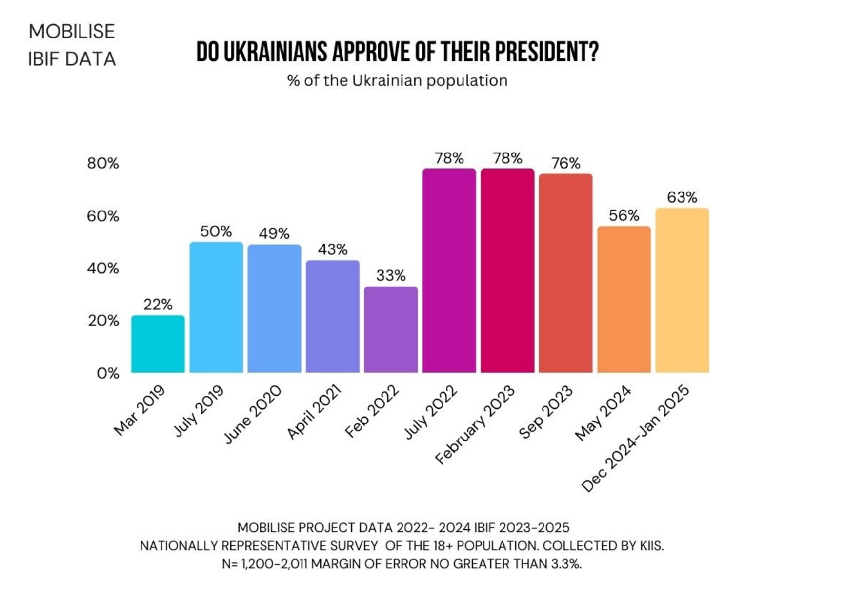 При этом рейтинг президента, в первые месяцы войны достигавший 90%, в последующее время предсказуемо снижался, но с начала 2025 года снова начал расти. Ниже 52% он не опускался никогда.