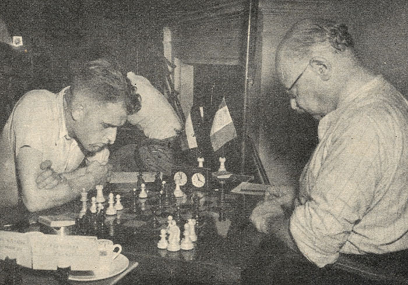 И опять же никаких источников и никаких упоминаний на других языках. Зато на сайте, посвященном 9-й шахматной Олимпиаде в Дубровнике, можно найти фотографию первого номера немецкой команды Вольфганга Унцикера, играющего с первым номером команды Франции Самуилом Тартаковером.