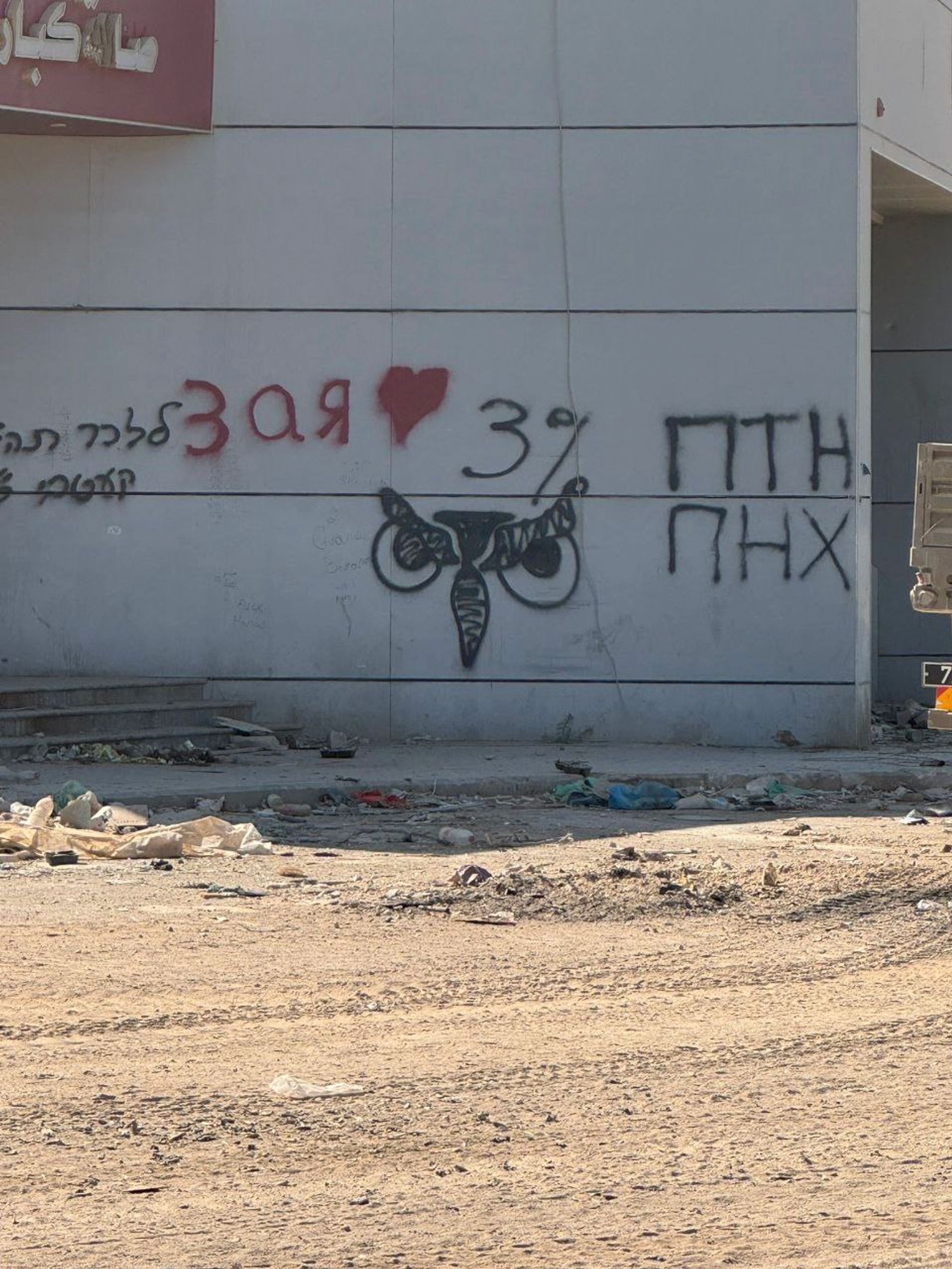 Видел в Рафахе русскоязычные граффити, в том числе аббревиатуру «ПТН ПНХ» — наверное, оставили какие-то наши бойцы, русскоязычные ребята. Также видел граффити с символикой израильских подразделений, какие-то аббревиатуры латиницей.