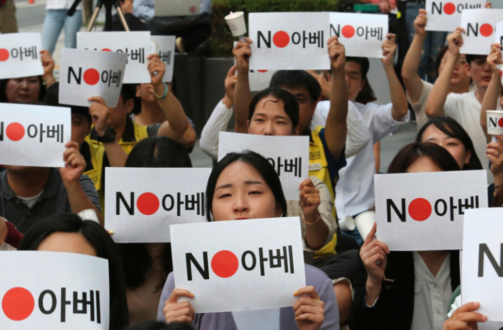 «Партия и народ едины»: в накалившейся обстановке корейцы дружно бойкотируют японские товары (сигареты, алкоголь, одежду, электронику). Отменяются заказанные японцами туры. В июле 50 тысяч корейских ритейлеров убрали с полок японские товары, даже самые популярные. «Этот магазин не продает японские продукты!» — такой плакат корреспондент The Wall Street Journal увидел недавно в одном из сеульских супермаркетов. Баннер над его входом добавляет: «Японии не хватает покаяния за прошлое!».