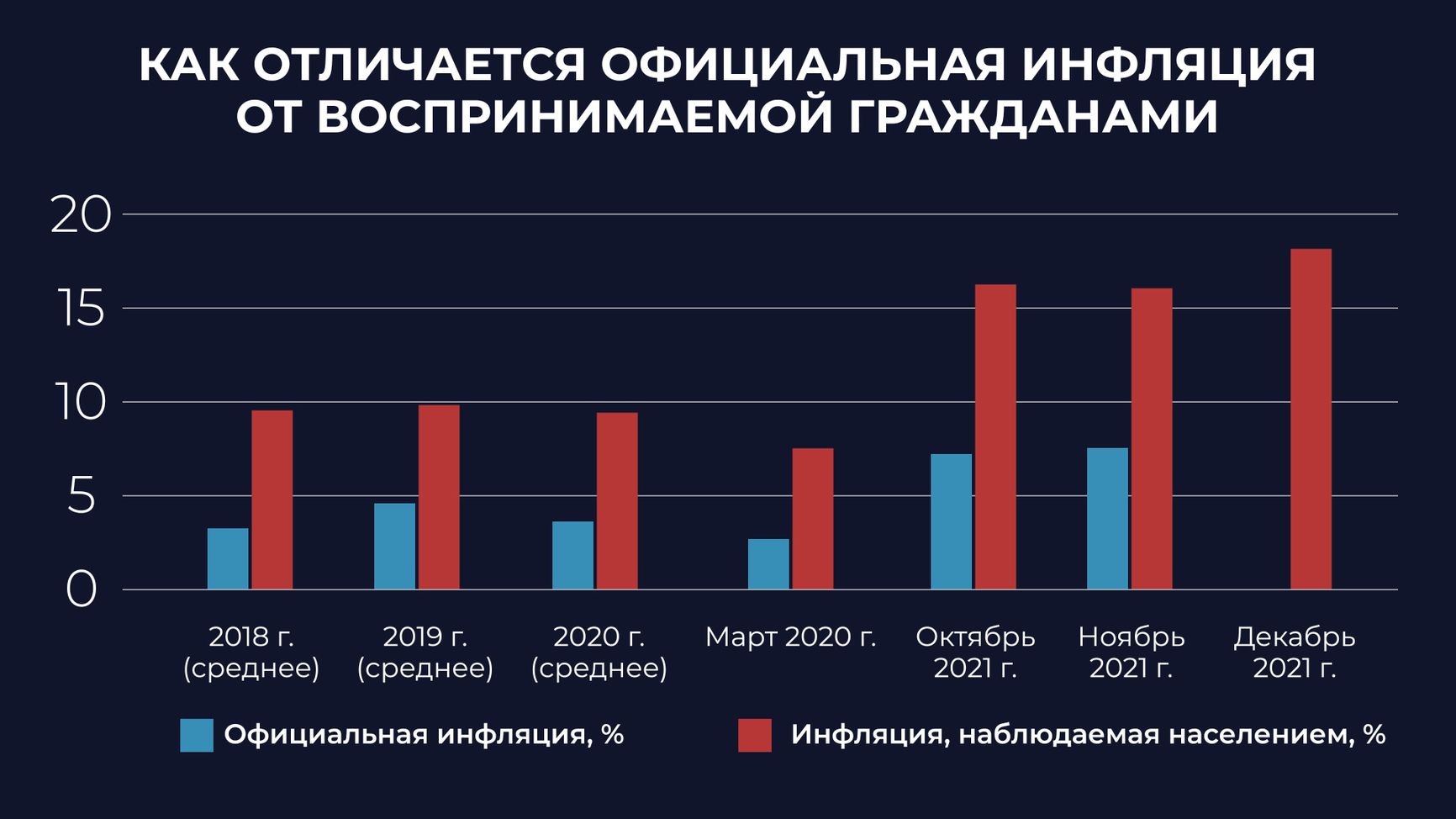 Официально показатель инфляции называется «индексом потребительских цен на товары и услуги», Росстат считает его по усредненной потребительской корзине, в которую входит более 500 показателей. Предполагается, что корзина среднестатистического россиянина должна совпадать с корзиной Росстата, но обычно повышение цен, которое люди ощущают на себе, выше официальных цифр. К примеру, если в 2020 году государственный показатель инфляции составлял в среднем 3,4%, то население, согласно исследованию «инФОМ», считало ее близкой к 10%. Почему так происходит?