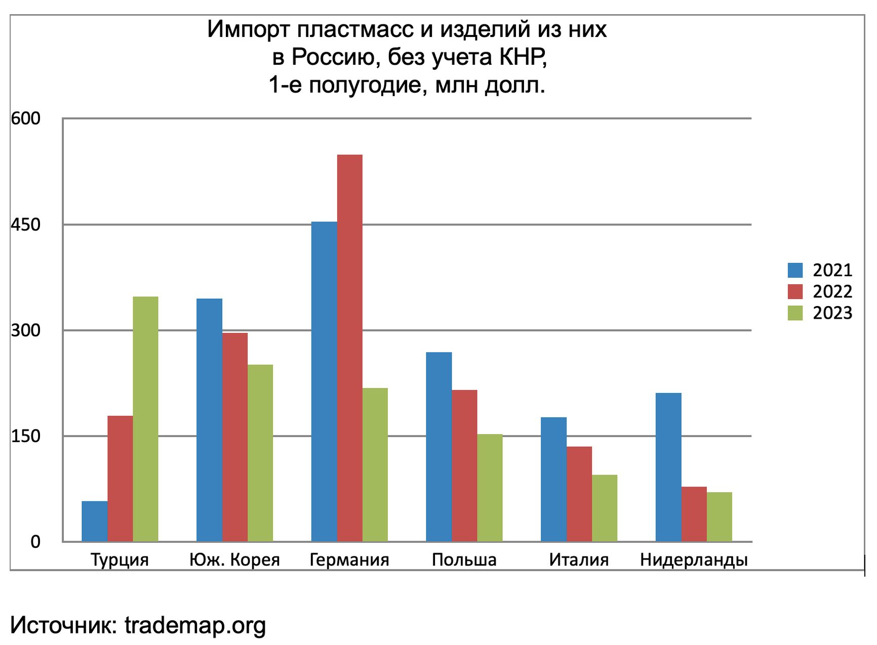 В группе «Пластмассы и изделия из них» доля Китая в 2022 году составляла 42,2%, а рост объема поставок относительно 2021 года — 37%. На втором месте Германия с долей 9,6% и годовой динамикой –47%, то есть фактически с двукратным падением. На третьем Турция с долей 7,2% и ростом за год в 2,5 раза. Как видно, дело стремительно идет к полному преобладанию китайских и турецких поставок. Однако ввоз пластмассы по другим маршрутам в 2022 году оставался еще значительным. Южная Корея отгрузила в Россию 7,2% всего импортного пластика, 4% пришло с южного направления (Азербайджан, Узбекистан и Иран) и 35% с западного (кроме Германии, значительные объемы пришли из Польши, Италии, Нидерландов). В 2023 году Турция как поставщик пластмассы в Россию вышла на второе место после Китая, а импорт из Западной Европы и Южной Кореи продолжил падать.