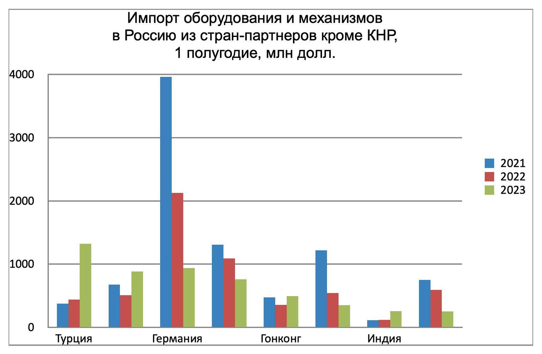 В самой значительной категории, где находятся «оборудование и механические устройства», в 2022 году непосредственно Китай обеспечил 48% российского импорта, а если добавить еще Казахстан (2,4%, главным образом реэкспорт из Китая) и контролируемый Китаем Гонконг (2,3%), получается в сумме 52,7% поставок с китайского направления. Турецкое направление дало еще 6,5%, из которых 4,6% — это сама Турция, 1,1% — ОАЭ и 0,8% — Индия. Еще 6,5% пришло с тихоокеанского направления, причем исключительно за счет «недружественных» стран: Южной Кореи (3,3%), Японии (2,3%) и Тайваня (0,9%). Остальные 34,3% — это по-прежнему западное направление: Германия (8,8%), Италия (5,9%), Польша (2,5%), Финляндия (1,3%), Чехия (1,3%) и др. Но из этих стран поставки машин и механизмов в Россию за 2022 год резко сократились: из Германии на 59%, из Италии на 22%, из Польши и Чехии на 60%, из Финляндии на 52%.
