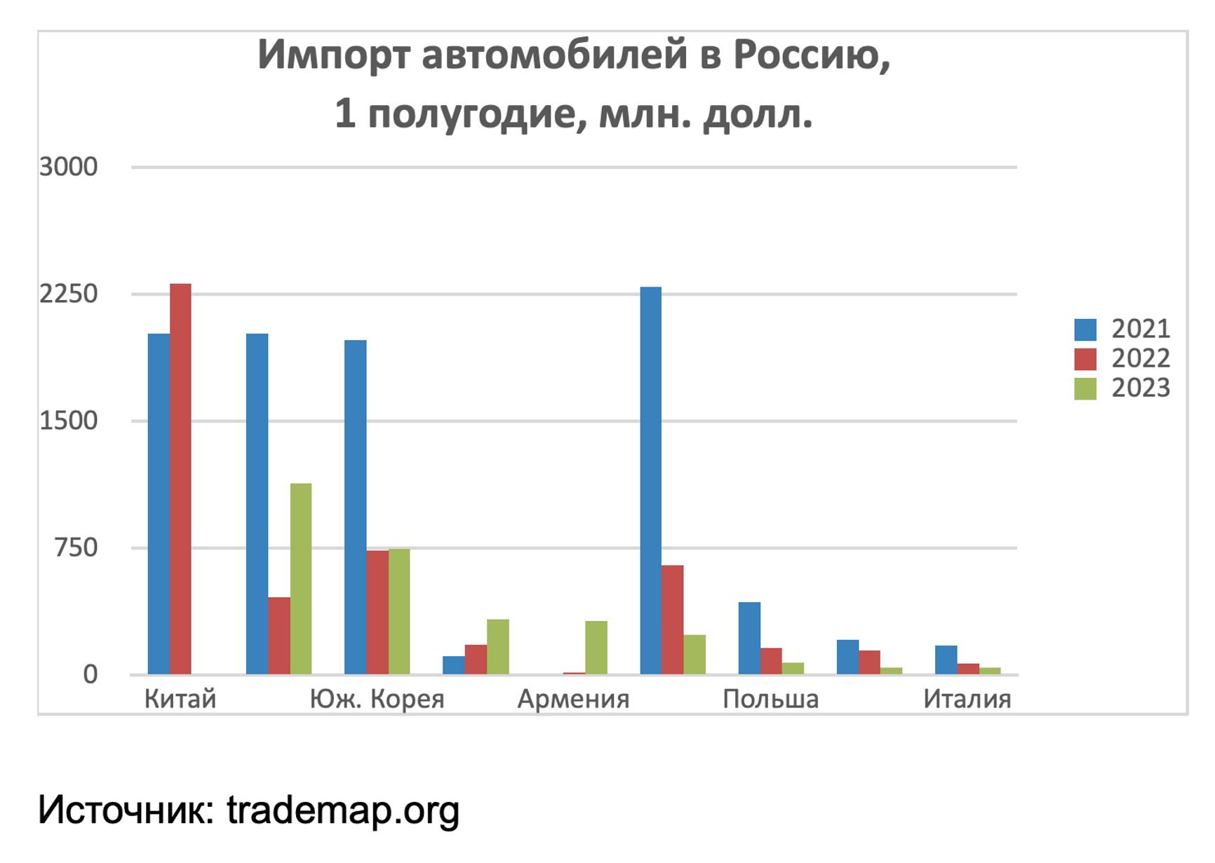 Итак, всего по турецкому направлению в Россию попадали 6% автомобилей (еще примерно 1% поступает из ОАЭ). А по тихоокеанскому — 29%, из которых Япония давала 18%, а Южная Корея 10%. И остальные 20% приходились на западное направление (Германия — 7,2%, Польша — 1,4%, США — 1,3%). Можно видеть, что в отношении импорта автомобилей доля поставок с Запада и из развитых тихоокеанских стран в 2022 году была еще достаточно высока, хотя и здесь уже половина всего торгового потока зависела от Китая и Турции. В первой половине 2023 года в Россию уже ввозили больше машин из Турции и Армении, чем из Западной Европы. Импорт из Германии упал почти в 10 раз по сравнению с 2021 годом.