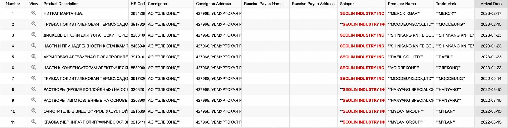 Seolin Industry Inc. из Сеула снабжает растворами, красками и прочими товарами удмуртское АО «Элеконд». Это одно из ведущих предприятий оборонно-промышленного комплекса России по разработке и производству электролитических конденсаторов. Есть у него и контракты с ВОМЗ.