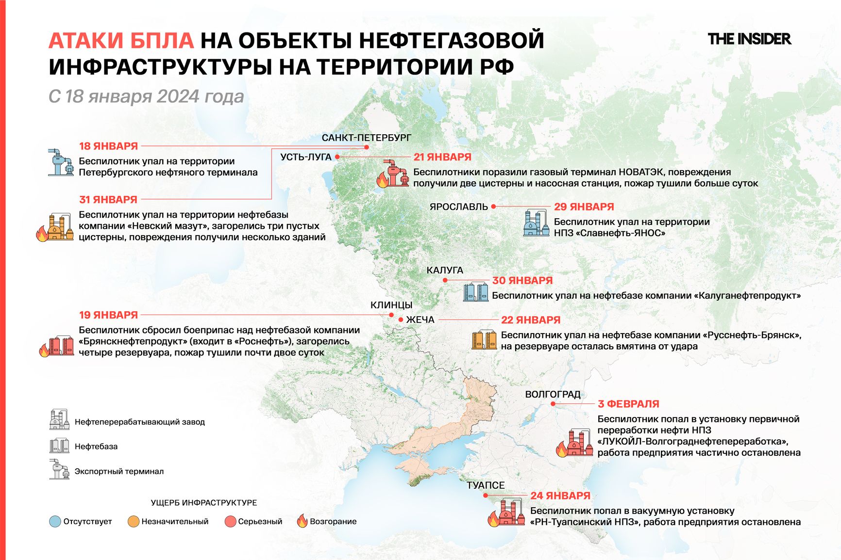 С начала года беспилотники долетели уже до девяти российских НПЗ, но по-настоящему результативных попаданий пока немного. Первой серьезной жертвой стал один из крупнейших нефтеперерабатывающих заводов России — НПЗ «Роснефти» в Туапсе. Загорелась вакуумная колонна, как уточнил источник The Insider в горадминистрации. По данным источников Reuters, работа завода остановлена до марта.