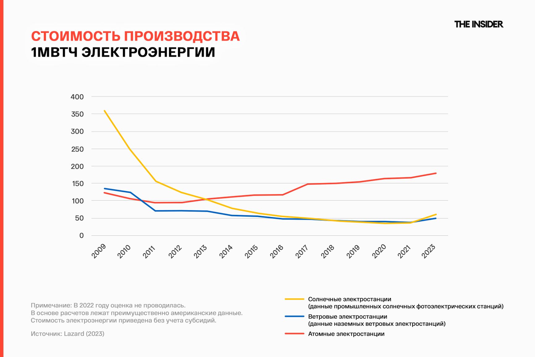 Для сравнения, солнечные и ветровые электростанции обычно строятся быстрее, чем за год, плюс они могут быть как очень маленькими, так и очень большими. При этом АЭС — это гигантские проекты, а жизнеспособность малых модульных реакторов — под большим вопросом.