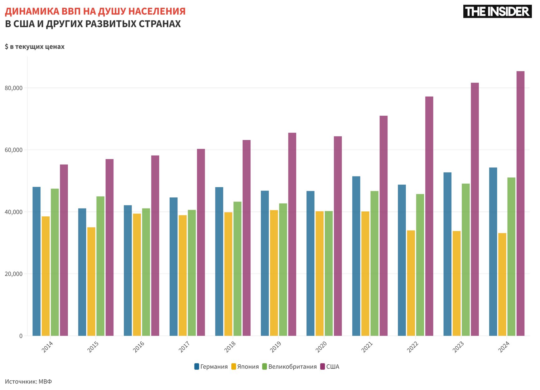 Джо Байден к числу своих достижений этого срока относит в первую очередь именно экономические успехи. И у него есть на то основания: по данным статистики, экономика США при Байдене находится на подъеме, опережая по темпам роста ЕС, Великобританию и Японию. Номинальный ВВП растет на сотни миллиардов долларов каждый квартал. ВВП на душу населения после пандемии вернулся на тренд стабильного роста. Инфляция снизилась с почти двузначных значений до 3,4%, безработица находится на небывало низком уровне в 3,9%.