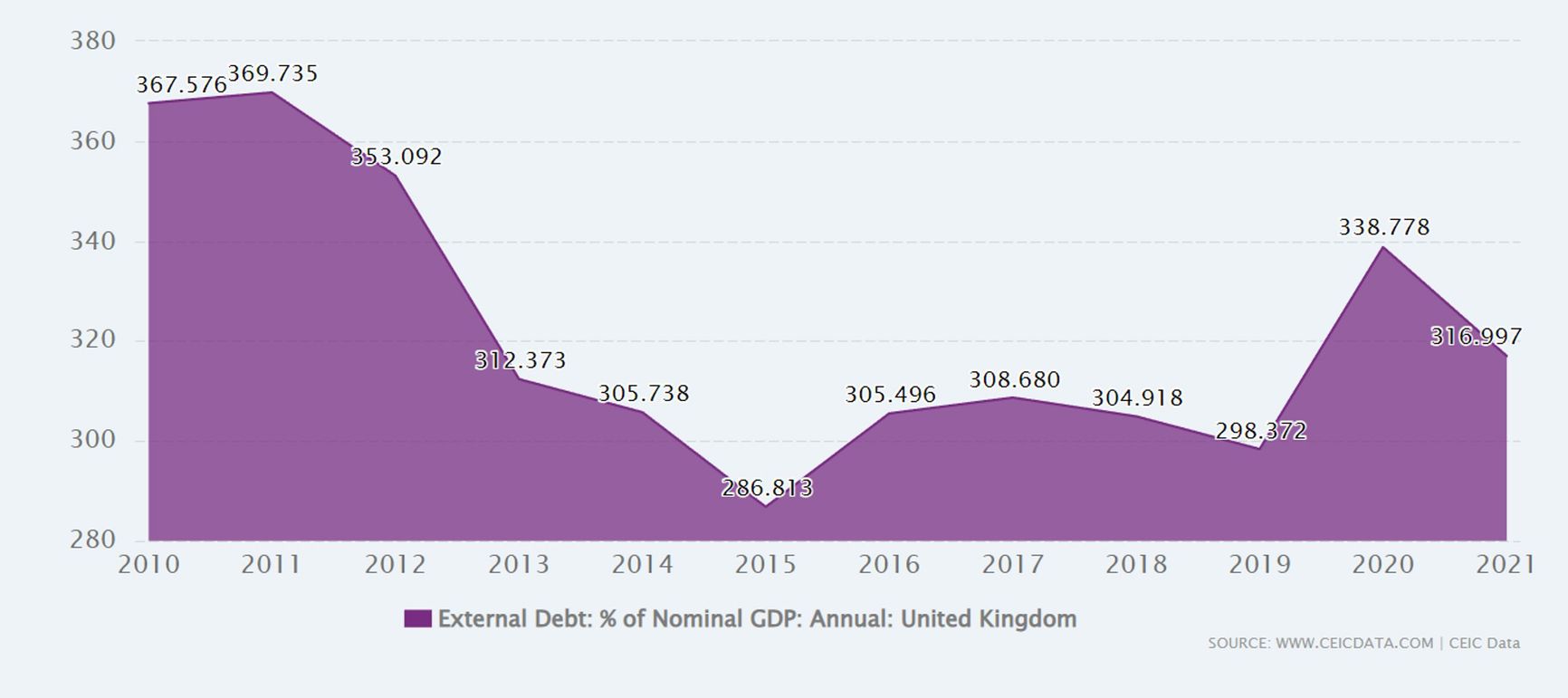 The same is true about the UK, where the ratio of the overall national debt to GDP is decreasing even regardless of the pandemic hike.