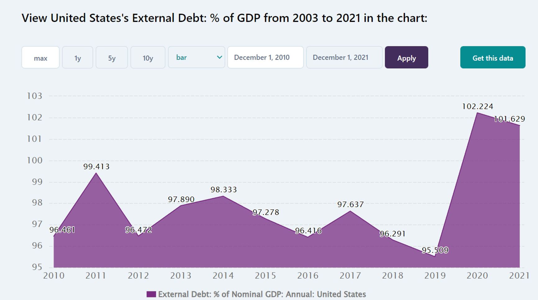 As a matter of fact, the US national debt is gradually shrinking as compared to the nation's GDP (which is in part explained by the 2020 spike caused by the COVID-19 pandemic).