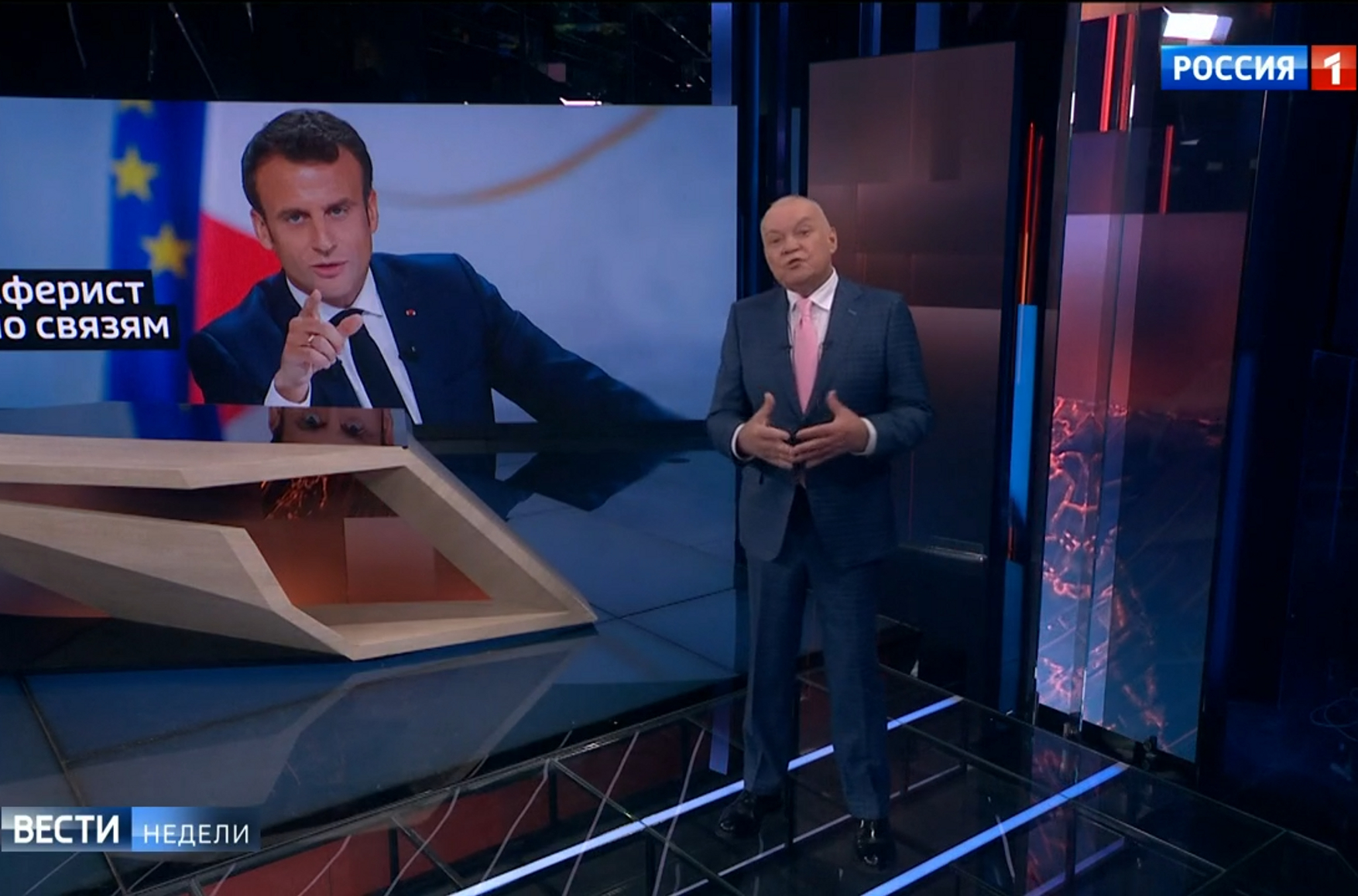 In his weekly news digest Vesti Nedeli, Russian propagandist Dmitry Kiselyov commented on Emmanuel Macron's recent televised address, in which the French president spoke about the military threat posed by Russia and Paris’s ability to protect European allies using its nuclear weapons. Kiselyov jumped at the chance to make a few dismissive remarks about France's military potential: