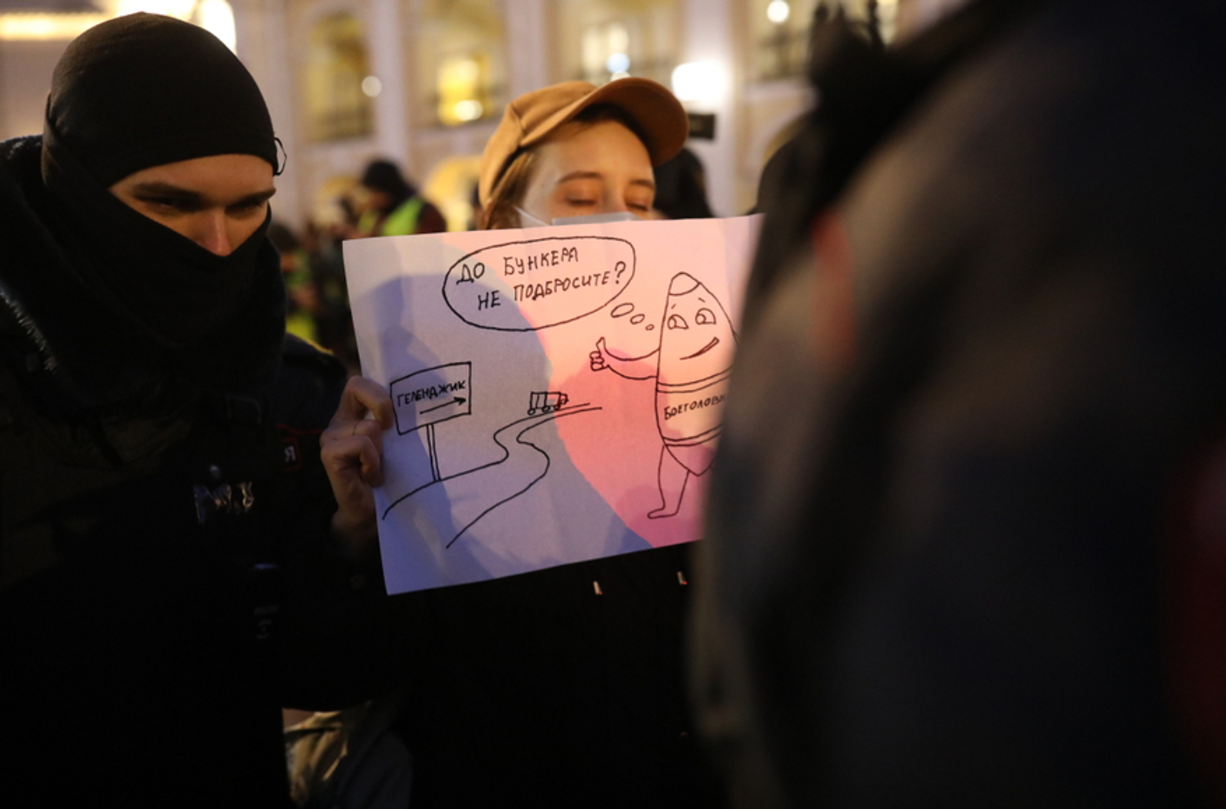 Dmitry Kuzmin holding up a poster against Vladimir Putin in front of the Kazan Cathedral in St. Petersburg.