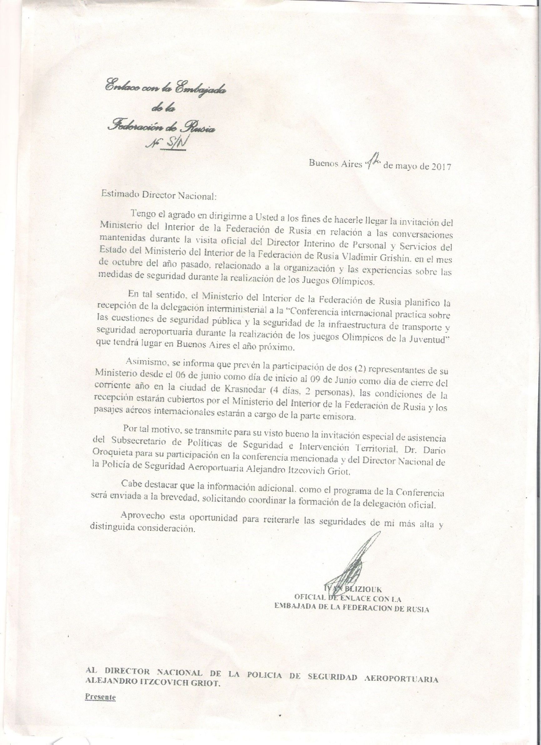 Apart from the diplomats, Blizniouk and Kovalchuk tried to get an in with the Airport Security Police (PSA, a special law enforcement agency in Argentina). On May 22, 2017, Blizniouk penned a letter to Alejandro Griot, head of the PSA, inviting him to Russia and signing the letter once again as a “Russian embassy relations representative”.