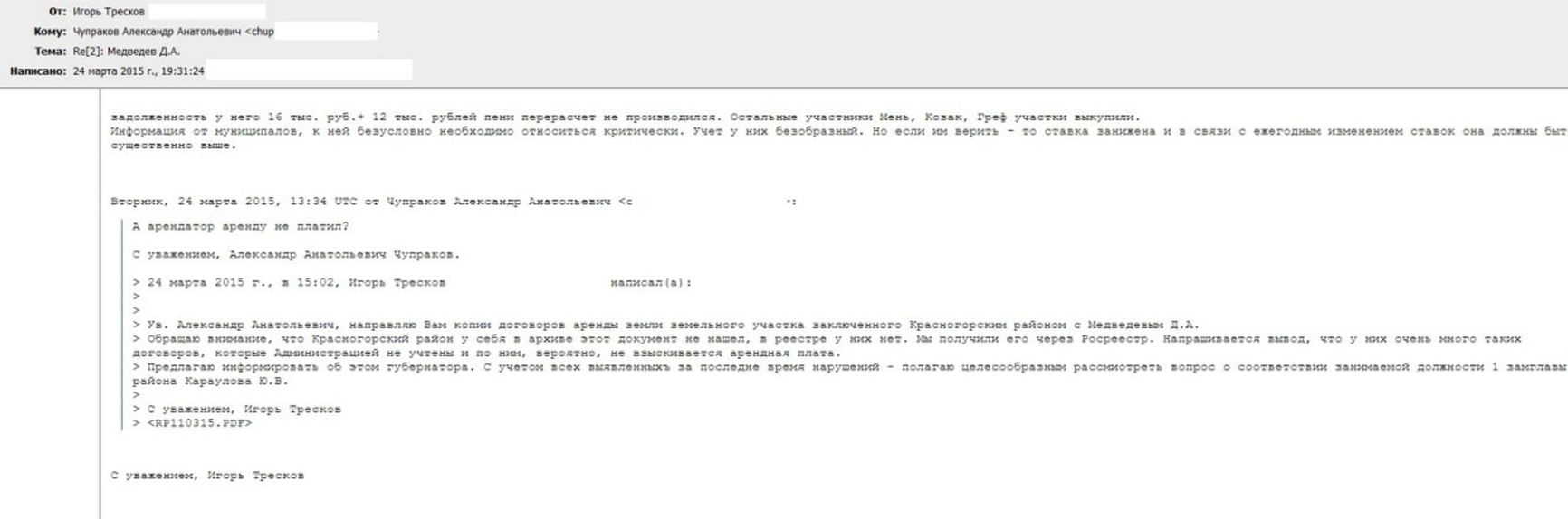 Dmitry Medvedev, ex-president of Russia and now deputy chairman of the Security Council, has been renting an elite land plot in elite district near Moscow since 2002, with the market value of nearly half a billion rubbles (around $8,5 million), for 1,500 rubles ($25), according to the documents from the hacked correspondence of Igor Treskov, vice-governor of the Moscow Region. The documents were published by the Telegram channel Black Mirror. Interestingly, Medvedev has not paid even this puny amount. The correspondence shows that the neighboring plots are owned by other ministers and officials. Most likely, the land plot was given to Medvedev for his assistance in closing the criminal case against the head of the Krasnogorsk district.