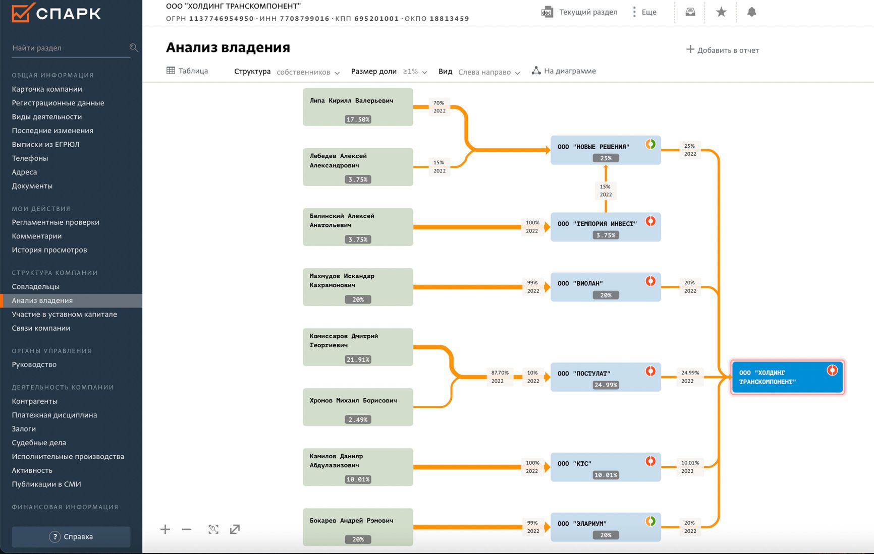 Iskandar Makhmudov and Andrey Bokarev each own 20% in TransComponent Holding through a chain of legal entities (Violan LLC and Elarium LLC). The remaining shares are owned by their partners who are less known to the general public.