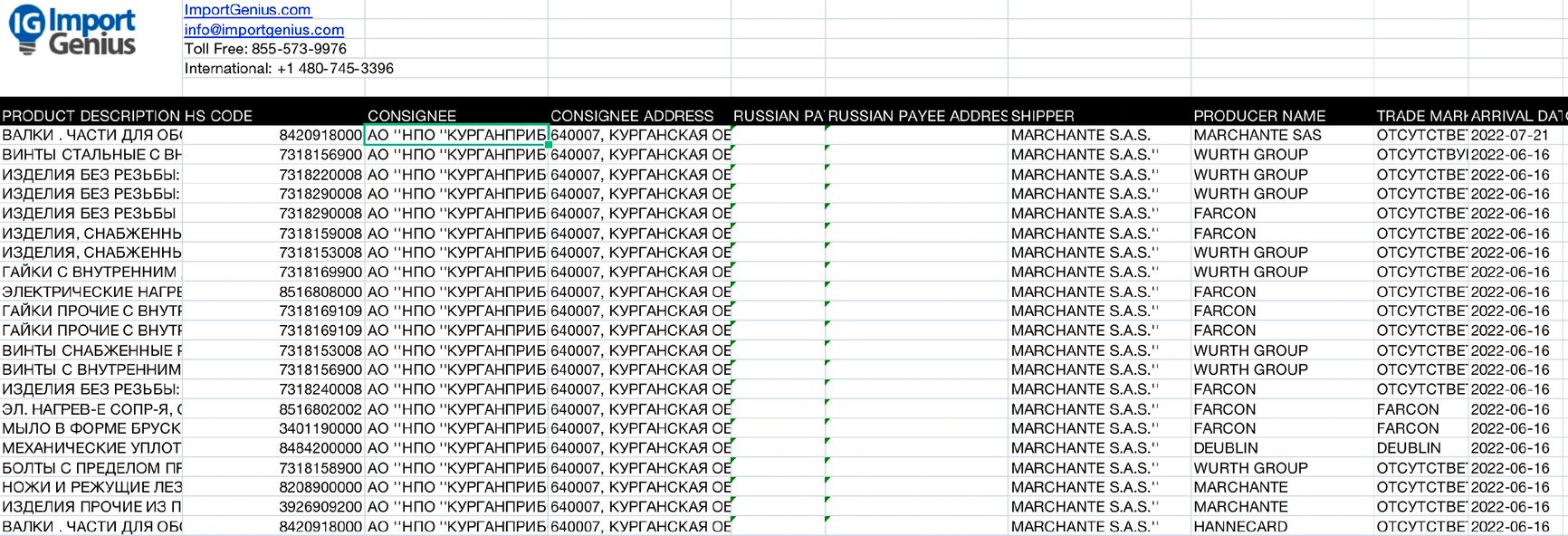 The French company Marchante supplied the Russian arms company Kurganpribor with various technical products during the war.