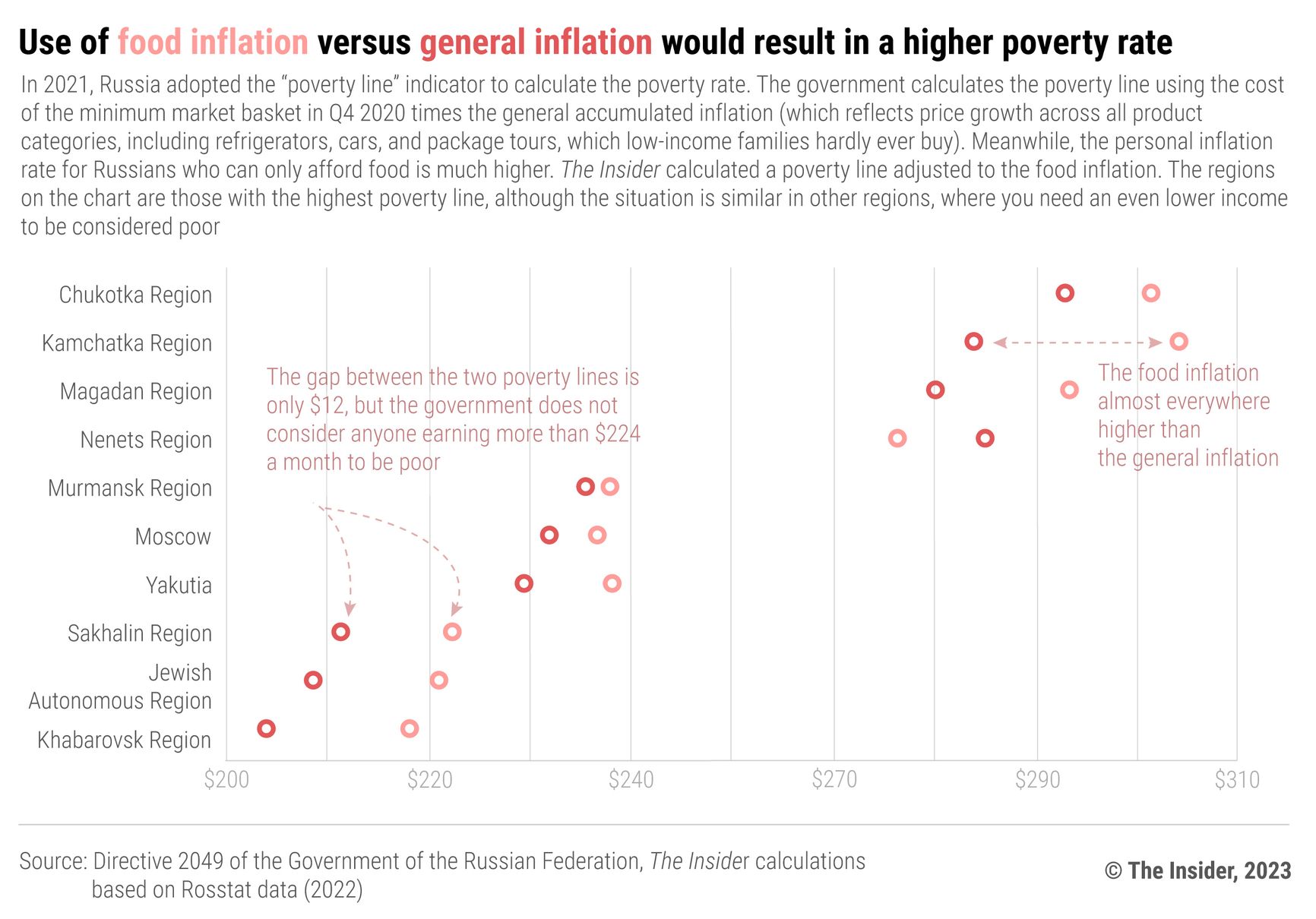 Official statistics suggest that Russia's poverty rate has plunged below 10% for the first time in history: only 9.8% of its population is poor. According to Rosstat, the number of Russians living in poverty dropped by 1.7 million in 2022. However, this ‘success’ results from a primitive statistics trick: before 2021, the poverty line directly correlated with food prices, but the authorities invented a new approach to the poverty line, assessing relative values for each region. Under the earlier methodology, we would see an additional 2.3 million poor in Russia. Tampering with statistics, the Kremlin both reports progress in the combat against poverty and saves money on income supplements. The Insider's analysis reveals these indicators are lowered intentionally and living off the living wage remains impossible.