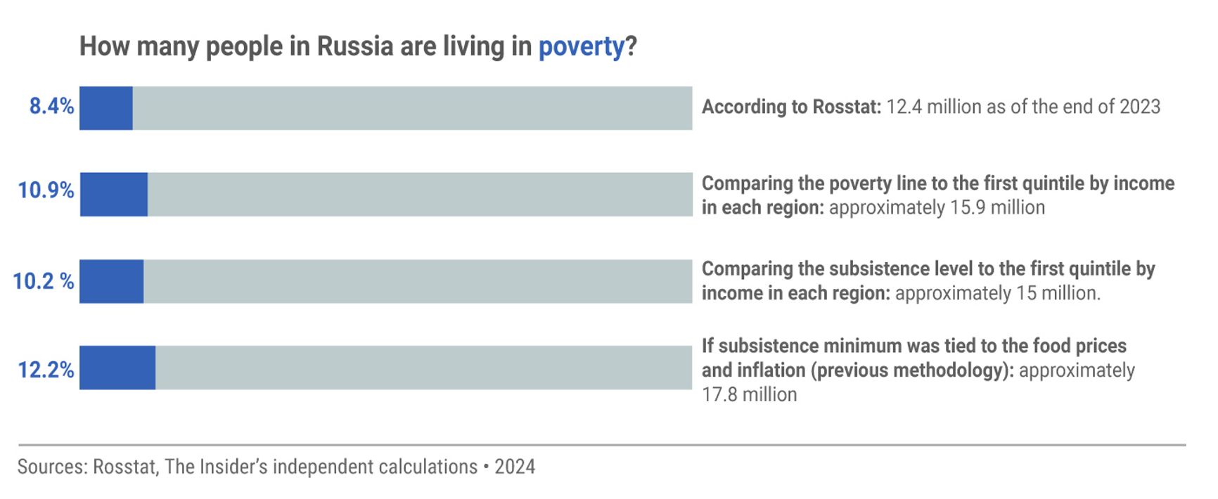 The government, however, sets the poverty line much lower, counting only those earning less than 14,300 rubles per month are registered as “poor” in the state’s poverty statistics. By the end of 2023, Rosstat reported 12.4 million people living in poverty (a record low 8.5%). This figure rose to 13.3 million by mid-2024. Yet just two years earlier, in 2021, the agency reported 17.8 million poor people. Has poverty genuinely decreased since the war began? The short answer is no. Rosstat simply changed its calculations to align with President Putin’s May decrees, which require the government to reduce poverty to below 7% of the population by 2030. The Insider has thoroughly examined these statistical manipulations.