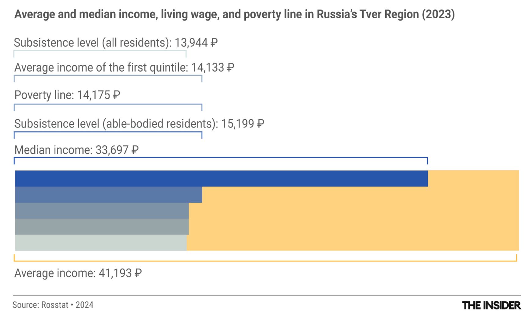 In fact, the average earnings of the 20% of the population with the lowest income across Russia is 14,564 rubles, while the poverty line for 2023 was set at 14,339 rubles — an amount very close to the average of the poorest quintile. The Insider compared the average income of the bottom 20% in each region with the established poverty line. It turned out that the total population in regions where the poorest 20% have an income lower than the official poverty line for that region adds up to around 81 million people. Therefore, at least 16 million Russians in 2023 had an income below the poverty line.