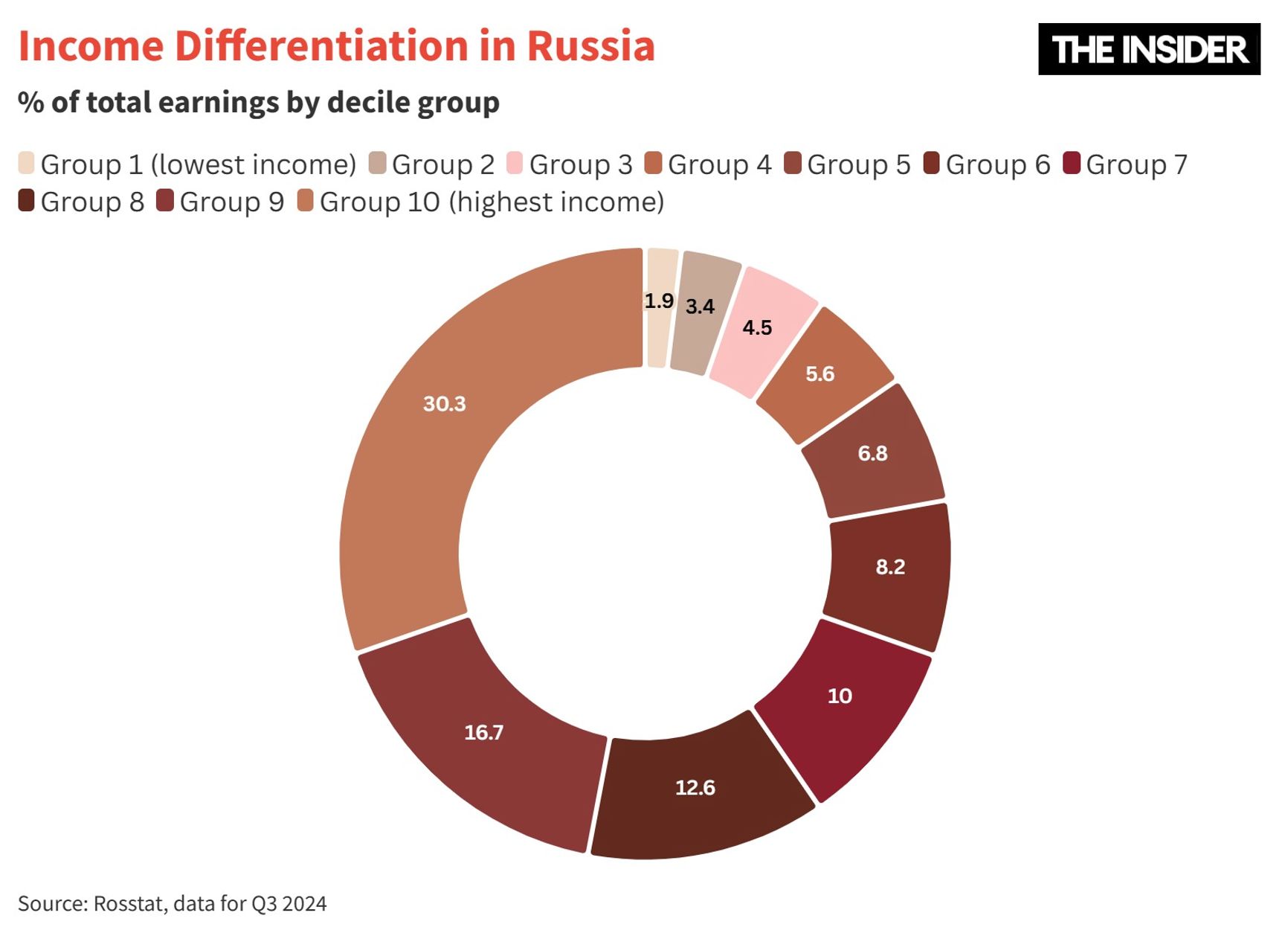 According to the World Inequality Database, even before the full-scale invasion, the top 1% of Russia's population received about a quarter of all revenues — against 12-13% in Europe. Today the share of income received by Russia's richest minority is even higher.