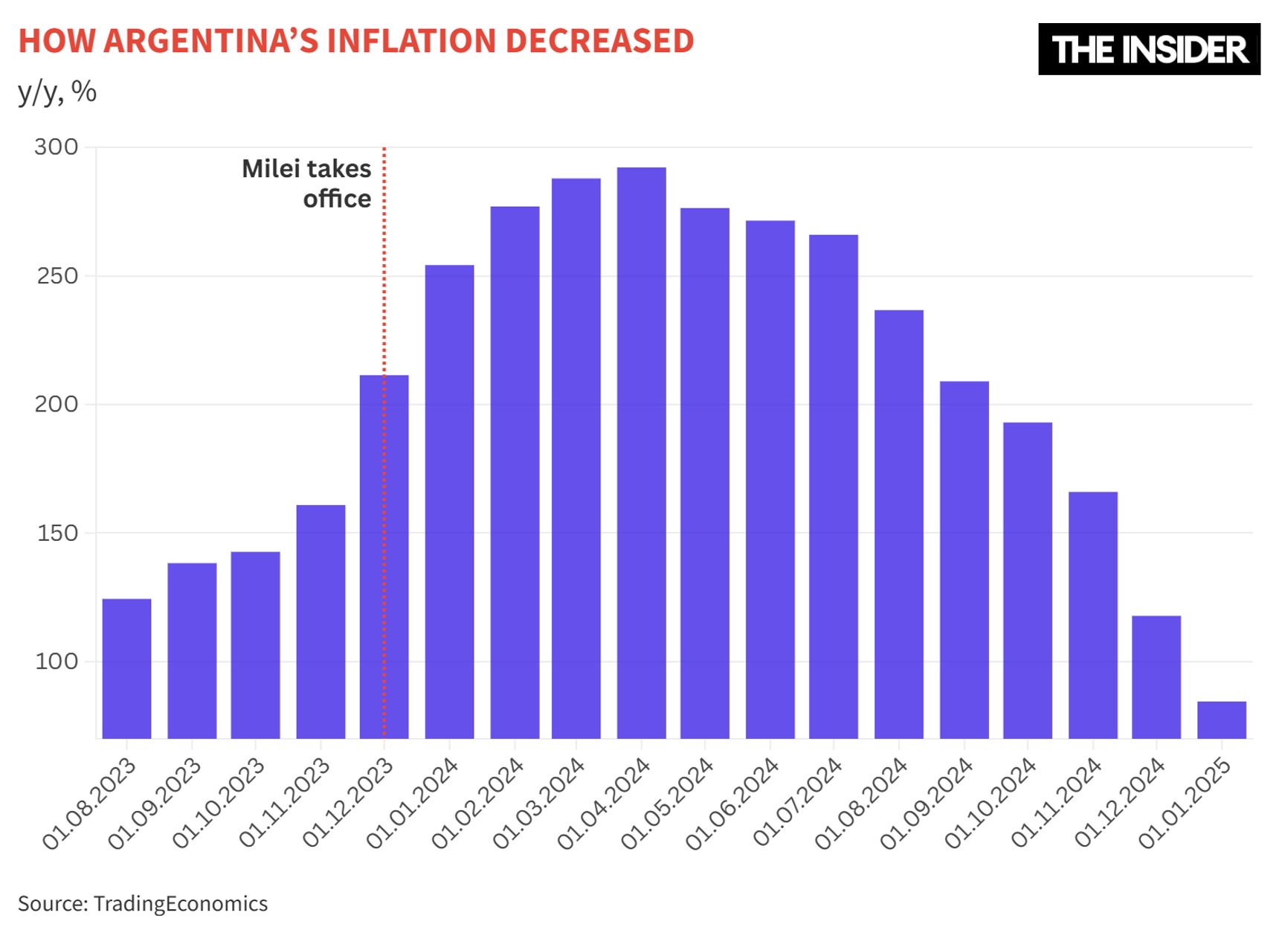 Thanks to all these steps, Milei achieved the country's first budget surplus in 14 years: at the end of 2024, it amounted to 1.76 trillion pesos, or 0.3% of GDP. The primary budget balance — surplus minus debt repayment — amounted to 10.41 trillion pesos, or 1.8% of GDP.