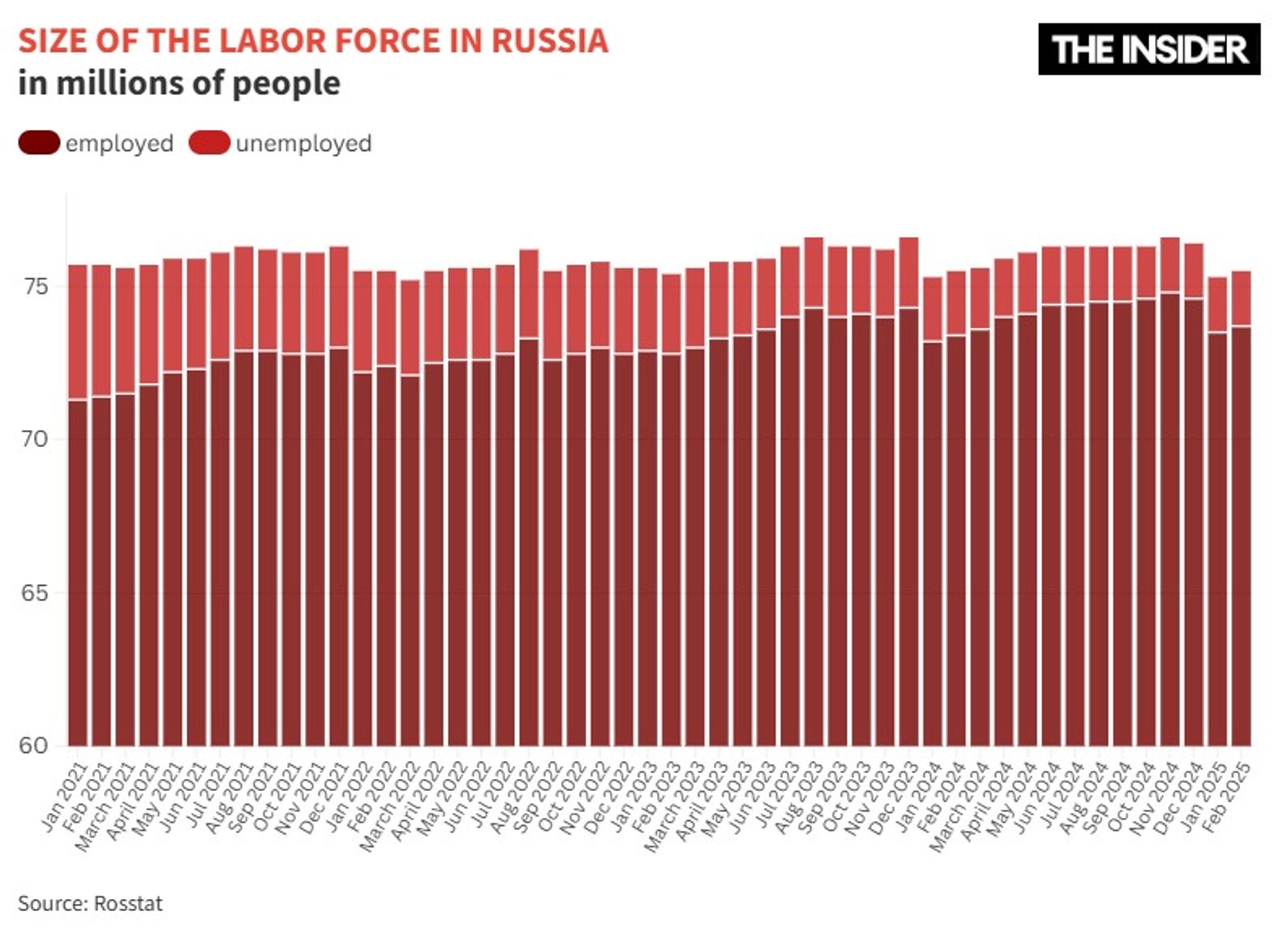 Stagnation in civilian industries has brought hiring to a standstill. Overall demand for labor in Russia dropped sharply in early 2025, reports the TsMAKP. To increase output, new factories must be built or existing ones thoroughly modernized — something that takes time and money, both of which are in short supply due to the Central Bank’s high interest rate, which primarily affects non-military sectors, according to the report.