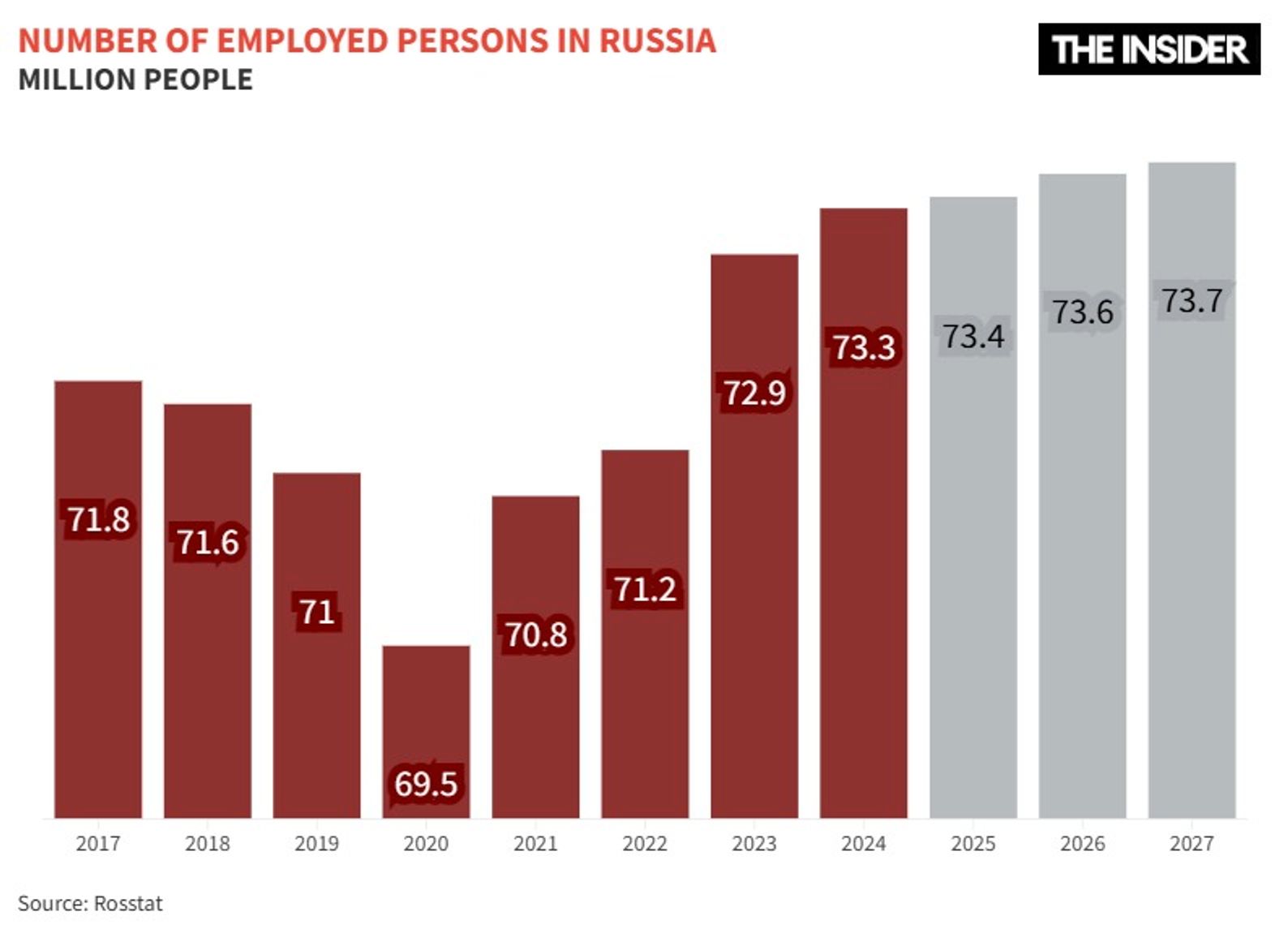 During the past three years of war, employment in Russia grew, and in December 2024 overall unemployment dropped to a historic low of 2.3%. “Employment began rising in manufacturing, engineering, and construction in 2023–2024 thanks to increased orders from the defense sector,” notes a VEB report on labor market trends. Employment also grew in IT and administrative services.