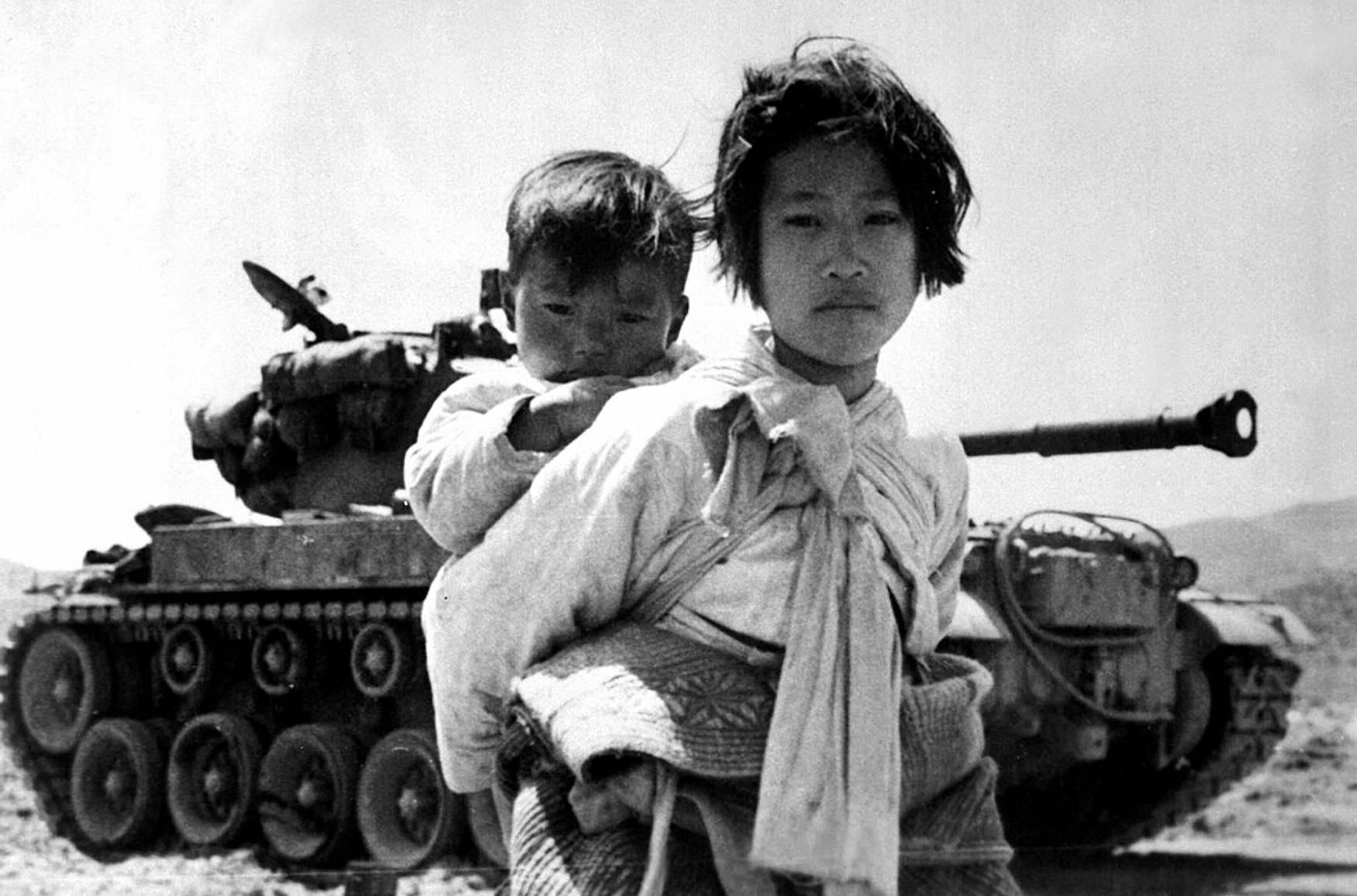 A Korean refugee girl trudges past a stranded M46 tank in Haengju, Korea, carrying her younger brother on her back
