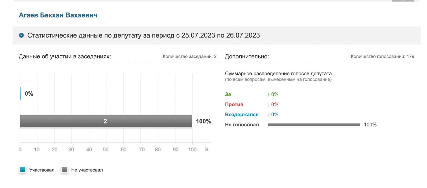 In late July 2023, the State Duma wrapped up another session. According to its voting records, United Russia party representative Bekhan Agaev continued posting news on his Telegram channel, but he did not cast a single vote on July 25 or 26.