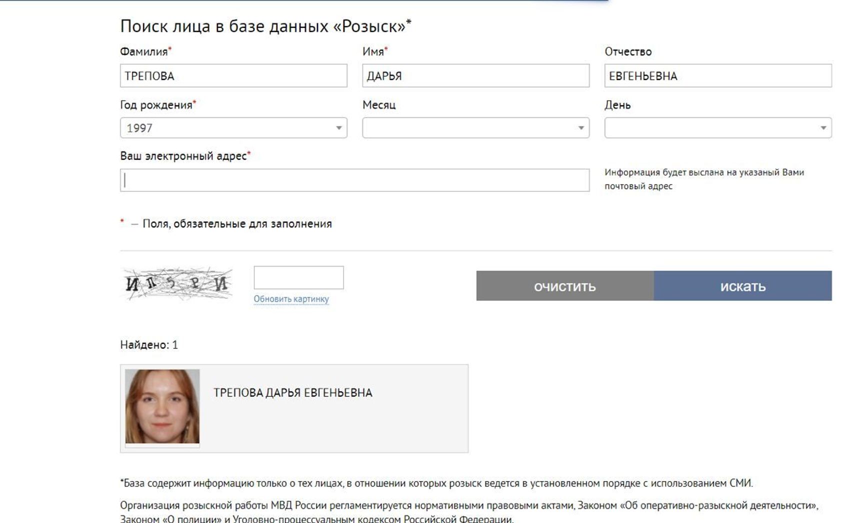 Multiple media outlets later reported that Russia’s Interior Ministry had put Trepova on its wanted list. The girl is wanted for a criminal offense, according to the police database:
