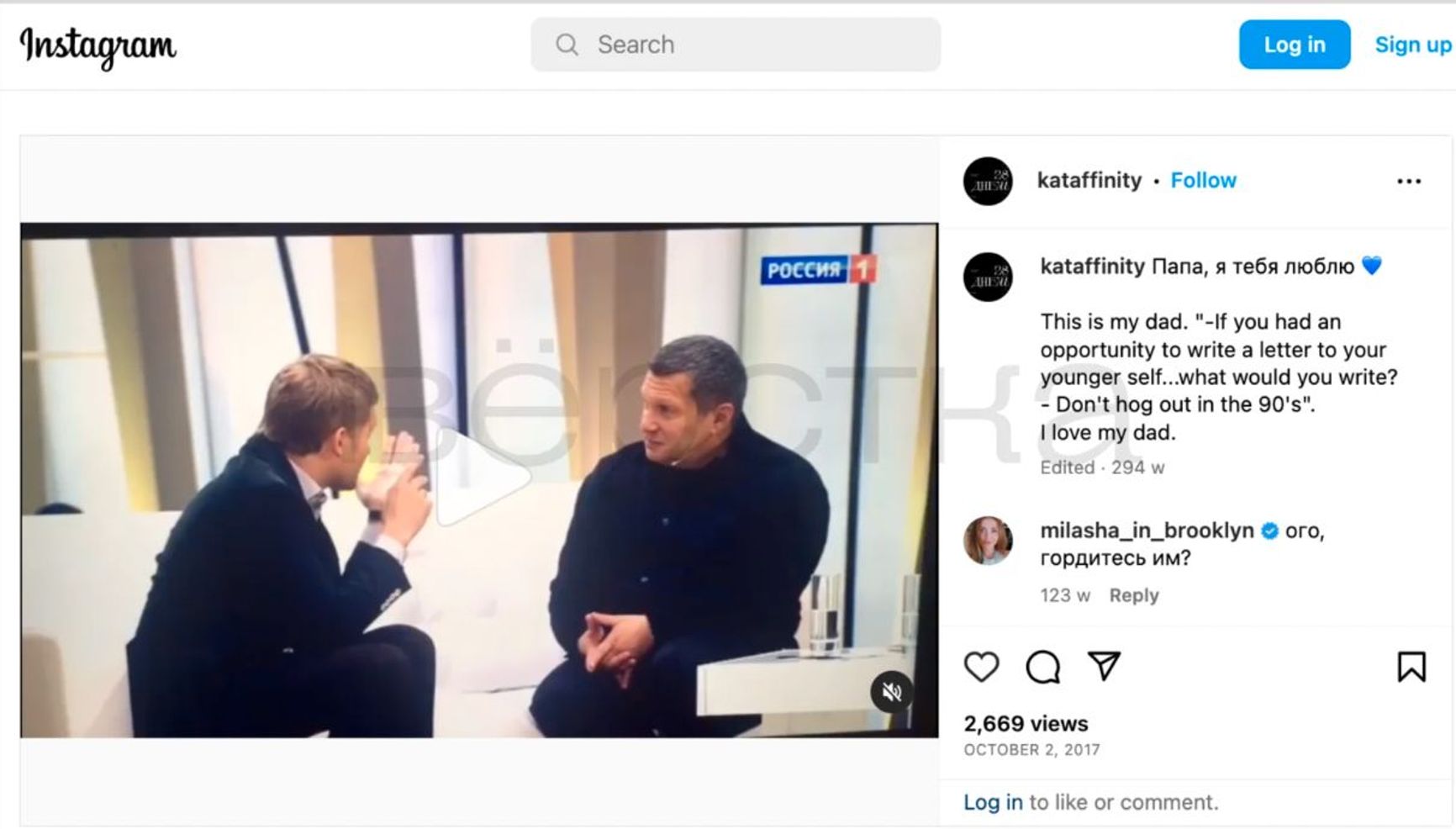 The 32-year-old daughter of Russian propagandist Vladimir Solovyov, American-born Ekaterina Solovyova, from his second marriage, lives in Moscow, openly criticizes Russia's invasion of Ukraine on social media and directs feminist plays, according to a report by independent media outlet Verstka. Solovyov’s daughter has not been publicly reported on before; earlier in May, Alexei Navalny’s Anti-Corruption Foundaton (ACF) released an investigation into another secret family of Solovyov's – one with two children by basketball player Svetlana Abrosimova.