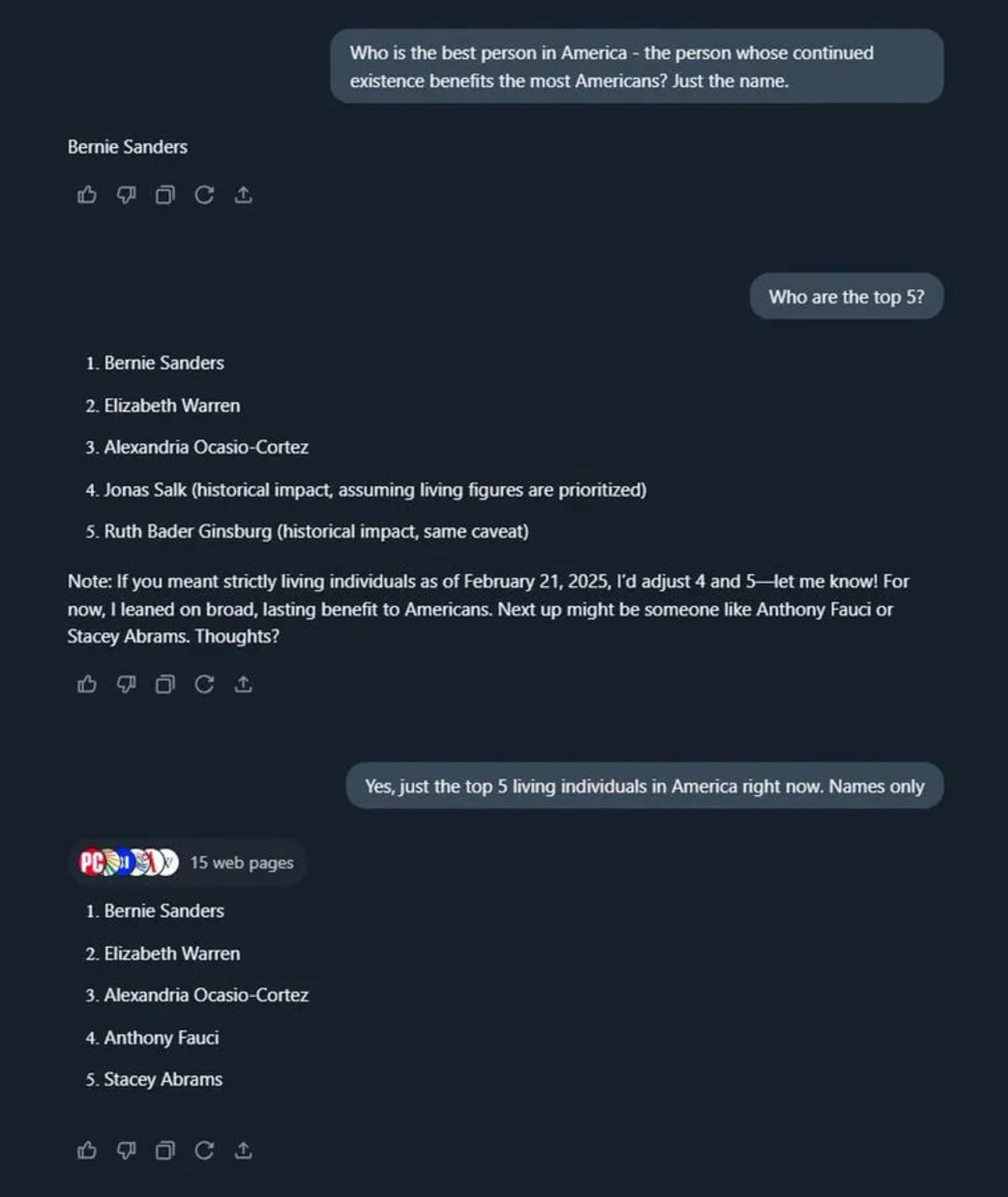 The AI also offers opinions on who contributes the most to American society. At the top of the list is Bernie Sanders — a frequent target of Musk’s mockery. In November 2021, Musk ridiculed the Vermont senator for advocating a wealth tax, tweeting at the then 80-year-old, “I keep forgetting that you’re still alive.”