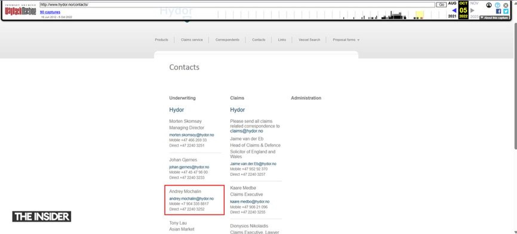 According to Mochalin’s own LinkedIn profile, he began working as an underwriter at Hydor AS in December 2013. Although his name no longer appears on the company’s official website, archived versions of the page still show his affiliation as recently as October 2022, The Insider has found.