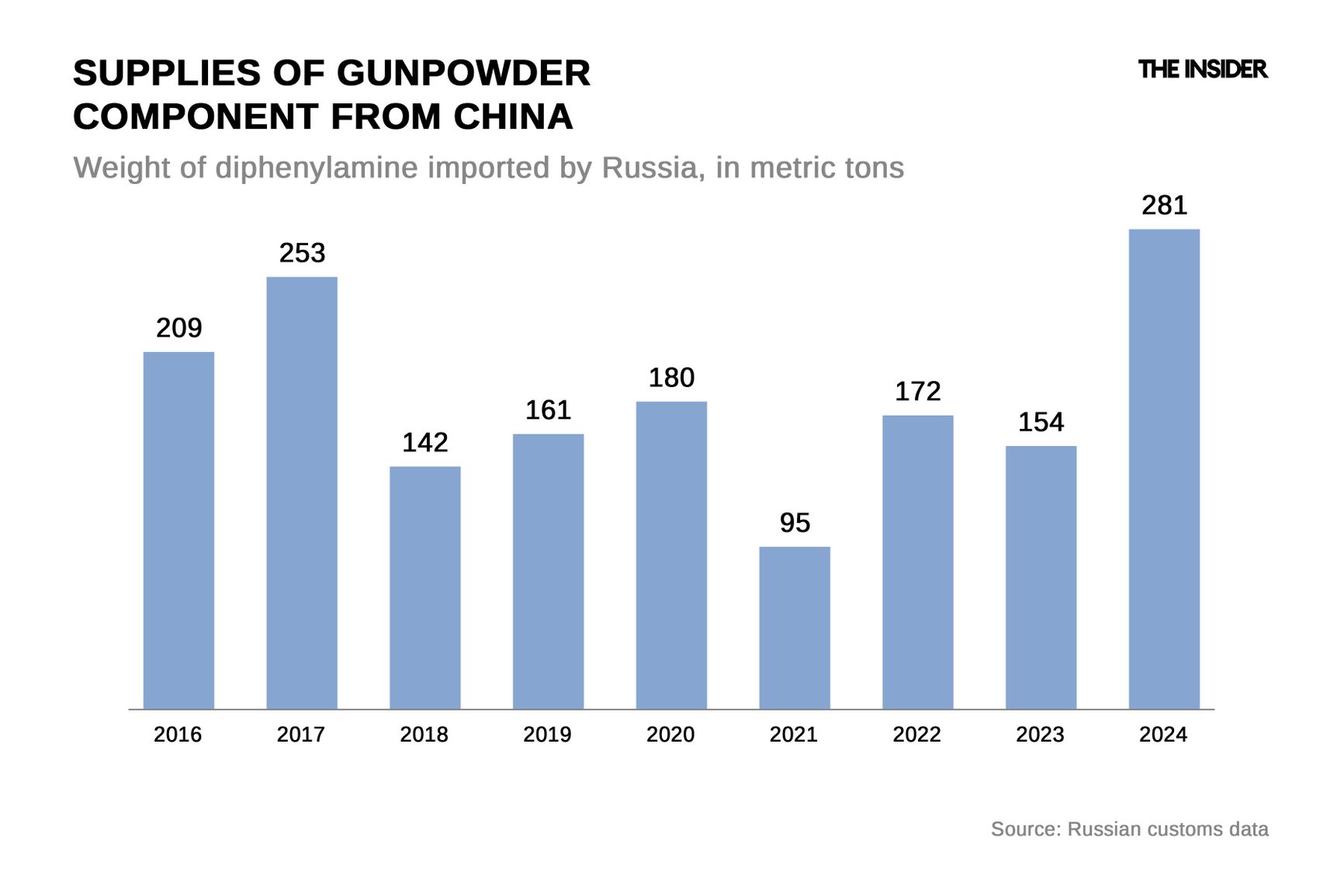 The Chinese company Jiangsu Feiya Chemical Industry, a manufacturer of diphenylamine and its derivatives, supplied Russia with massive amounts of this critical gunpowder component in 2024.