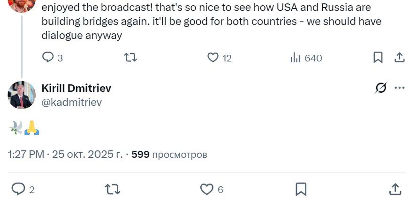 It is likely that the network operates through the infrastructure of the “troll factory” that was created by the late Wagner Group chief Yevgeny Prigozhin, the analysts said, though the current coordinator of the disinformation apparatus is unknown. Whether Dmitriev himself is aware of this campaign also remains unclear. In one instance, however, he personally responded to a bot’s comment praising his CNN interview by posting emojis of praying hands and a peace dove.