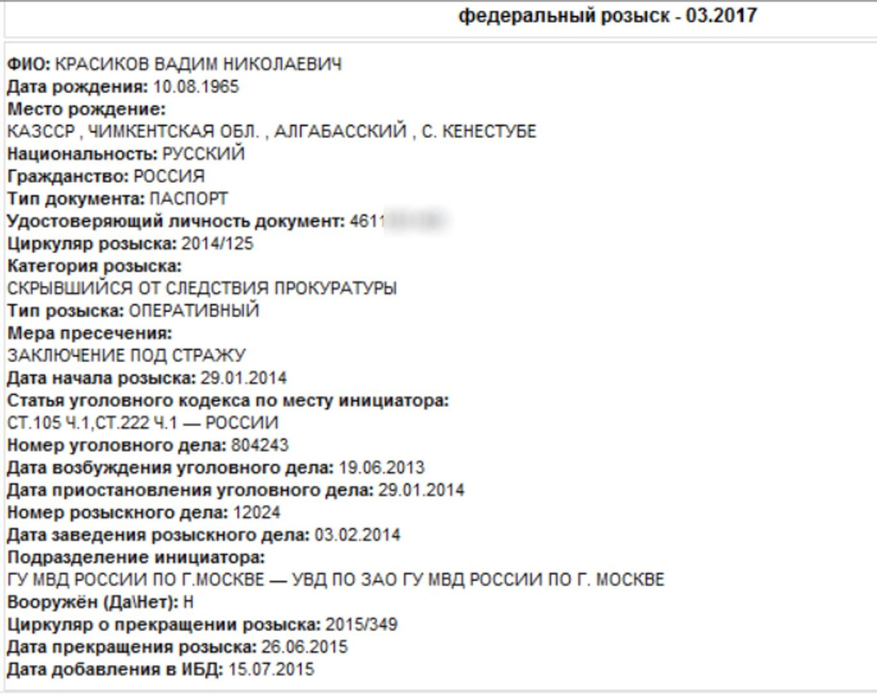 Vadim Krasikov was born on August 10, 1965, in the village of Kenestobe in the Turkestan region of Kazakhstan. In the 1980s, his family moved to Buryatia. Krasikov got married there and moved to Irkutsk with his wife and two children. He moved to Moscow in 2019, but it is possible that even before the Moscow murder he had already committed crimes. In any case, it is known that the law enforcement agencies of Karelia were looking for him back in 2007 in connection with one of the criminal cases. Several sources with access to police databases have confirmed that Vadim Krasikov cannot be found in the Interior Ministry's Integrated Data Bank (IDB), although the off-line database contains a search circular letter, No. 2014 125, which lists the date Krasikov was struck from the wanted list (June 26, 2015) and the date the information was added to the IDB (July 15, 2015). This means that someone wiped out Krasikov's data from the database after the fact.