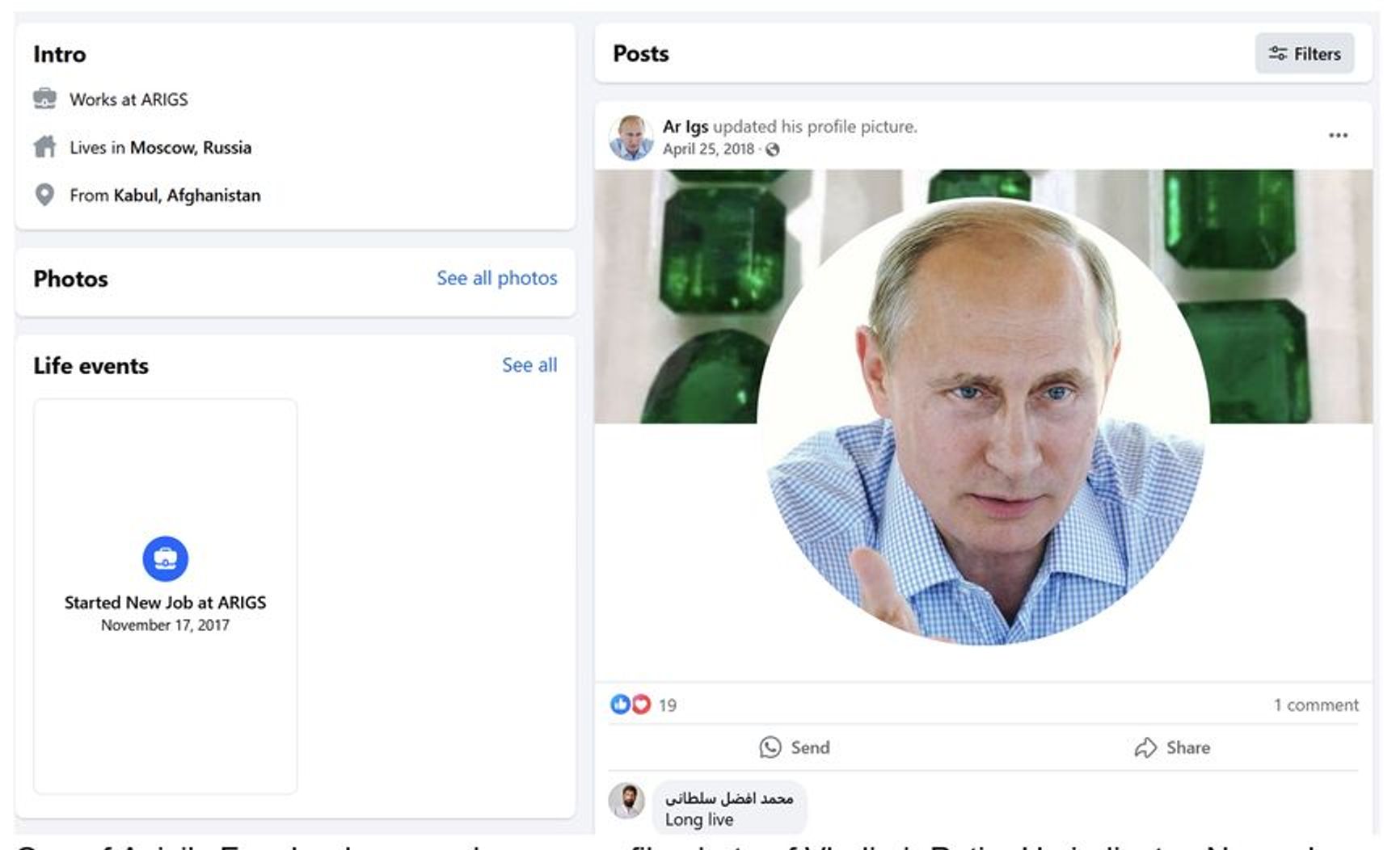 Using his “Akhmadov” identity, Azizi incorporated a Russian company, ARIGS Ltd., in September 2017. (The entity’s name is presented on its Facebook page with a space in between the letters, as AR IGS, and was presumably formed from the initials of Azizi’s fake identity, plus IGS.) Its declared purpose was trading in diamonds and other precious stones. According to one ex-NDS official, Azizi’s father, Enayatullah, registered a similarly-themed company in Kabul at around the same time. The NDS surmised that gem-trading between Russia and Afghanistan was one of the methods used for funneling funds connected to the bounty program. According to data from the Russian trade registry, ARIGS ceased its activity in 2020 and was liquidated in 2022.