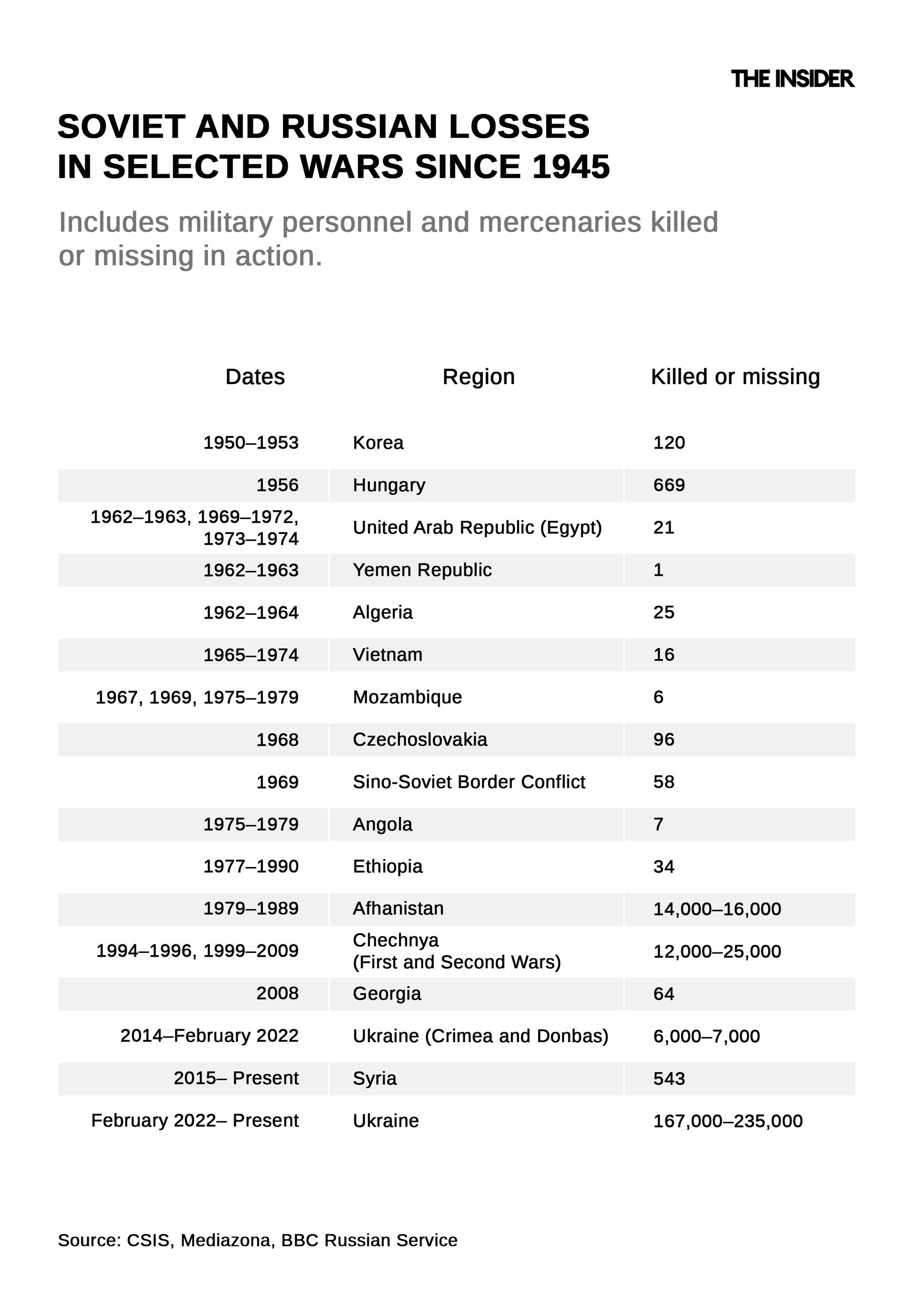 Even the lower estimate of 167,000 killed exceeds Russian and Soviet losses in all conflicts since 1945 combined.