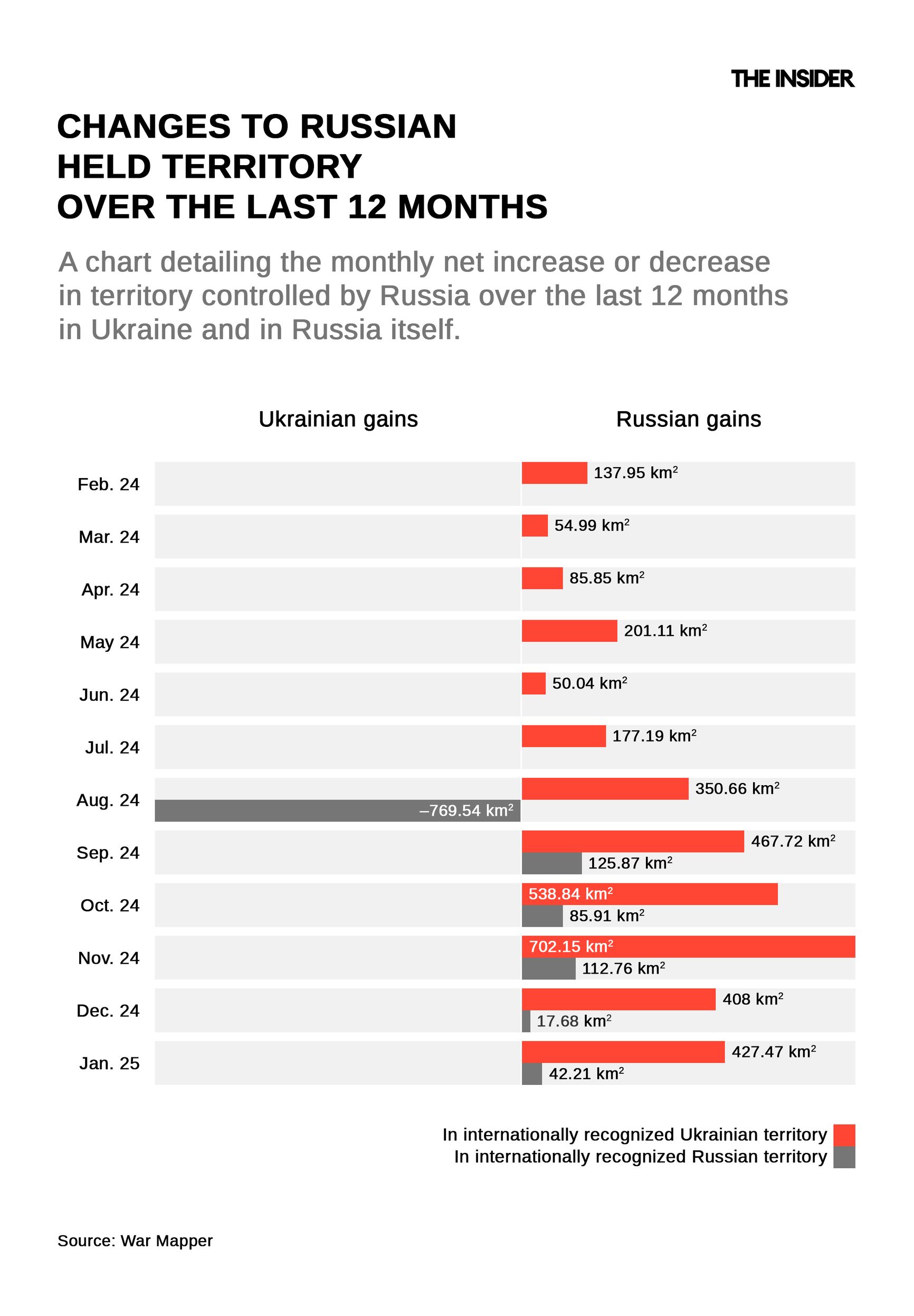 By the third year of the war, the intensity of losses remains high despite minimal shifts in the front line. From February 2024 to February 2025, Russian forces seized 3,600 square kilometers in Ukraine and took back 380 square kilometers in the Kursk Region while losing at least 78,000 troops.