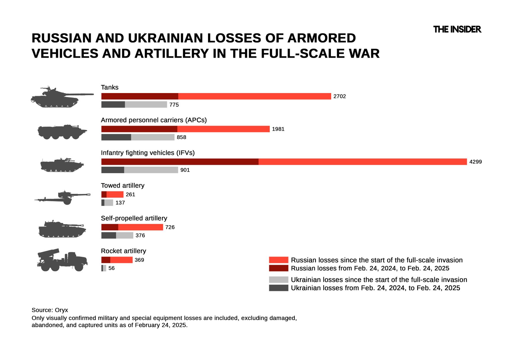 Total heavy equipment and artillery losses for both Russia and Ukraine over the past three years, based on available visual evidence, have surpassed 13,000 units — with 10,000 of those lost by Russia. In the past year alone, Russia has lost 4,000 pieces of heavy equipment — tanks, armored personnel carriers, infantry fighting vehicles, and various artillery systems — while the AFU has lost 1,100 units.