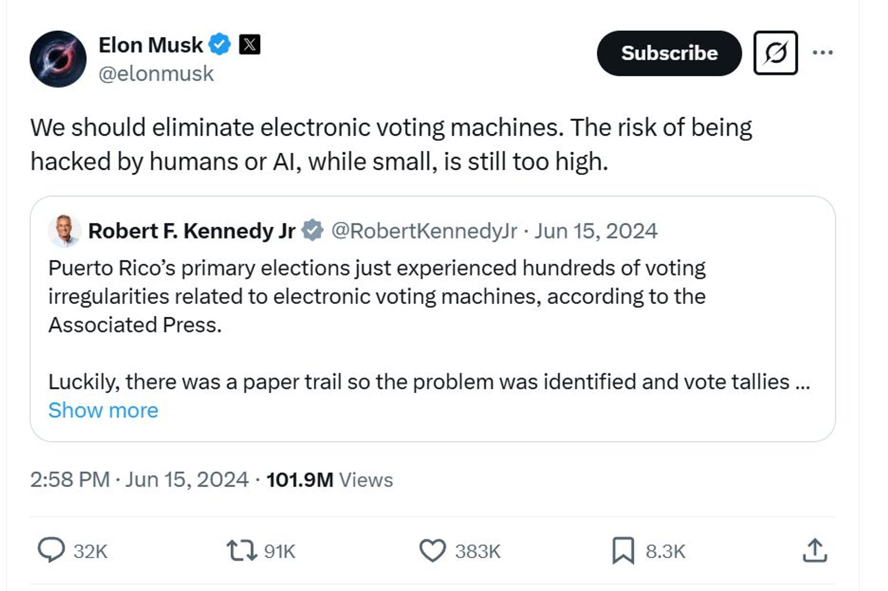 Starting in mid-2024 and continuing through the election in November, Musk actively pushed this old conspiracy theory — right alongside Russian propagandists. Thanks to the algorithms of X, which Musk has owned since 2022, his claims that electronic voting was untrustworthy reached hundreds of millions of people.