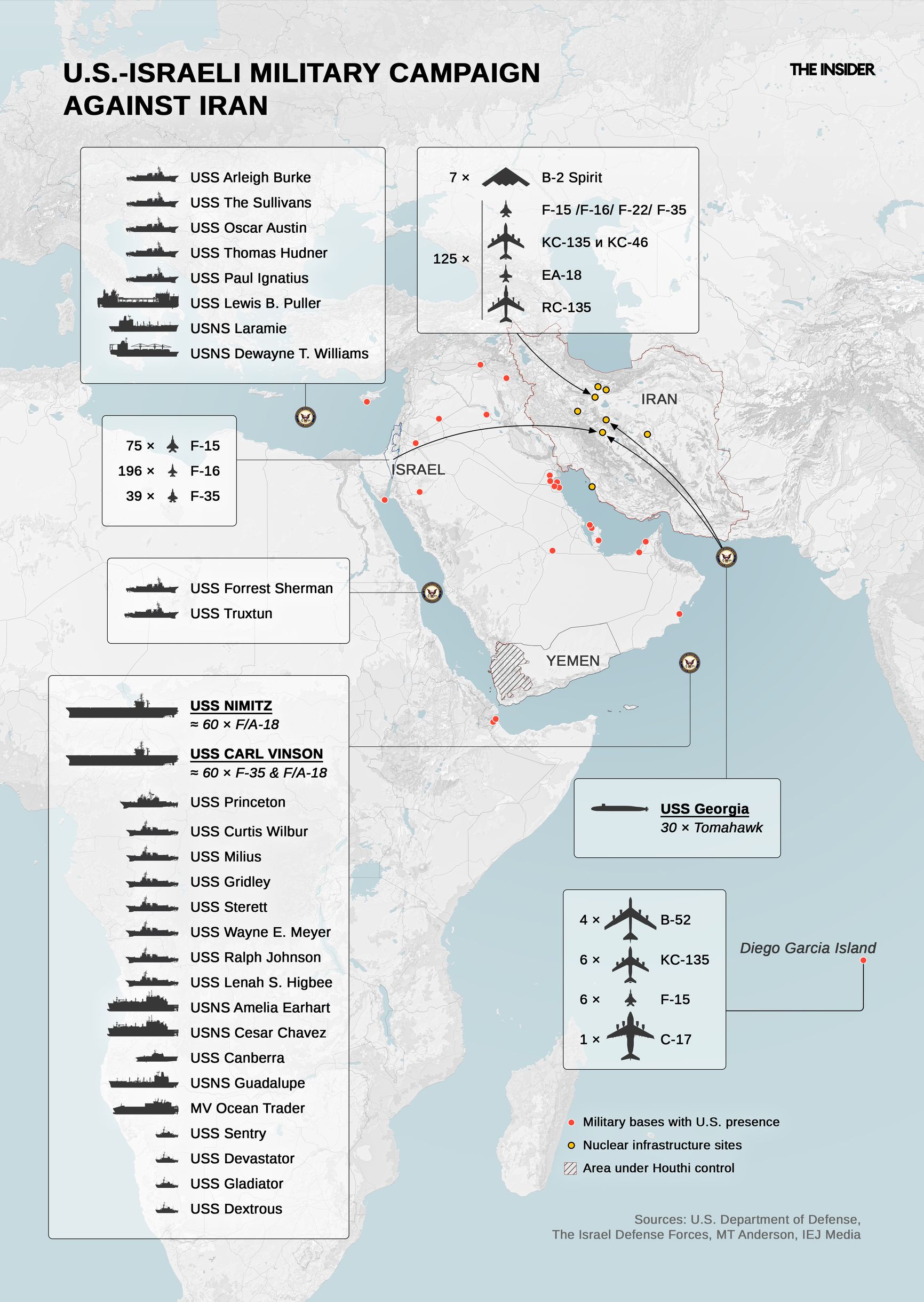 B-2 bombers struck Iranian targets directly from a U.S. base, completing the mission without stopovers and spending 37 hours in the air. They were supported by naval groups operating in the Mediterranean, the Red Sea, and the Arabian sea — including two carrier strike groups led by the USS Carl Vinson (CVN-70) and USS Nimitz (CVN-68), each with its own air wing.