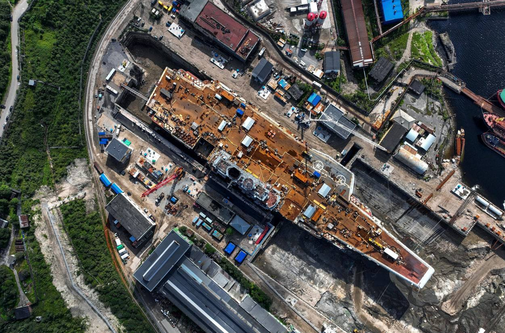 With PD-50 lost and no suitable facility available to continue the overhaul, the Admiral Kuznetsov was transferred to the 35th Ship Repair Plant, also located in the Murmansk Region. In order to accommodate such a large vessel, one of the dry docks had to be expanded and upgraded — at a cost of 23.9 billion rubles ($379.4 at the time).
