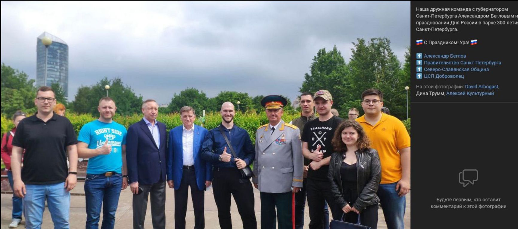 The Dobrovolets and NSC organizations are undoubtedly supported by the authorities, not just by Governor Beglov alone. Both are part of the Association of Military Training Centers in St. Petersburg and the Leningrad Region, and rent space from Prigozhin's Wagner Center. They also receive informational support from the Society for the Development of Russian Historical Education “Double-Headed Eagle” (Tsargrad) and Cyber Front Z. Additionally, neo-Nazis often take pictures with St. Petersburg's controversial, homophobic deputy, Milonov.