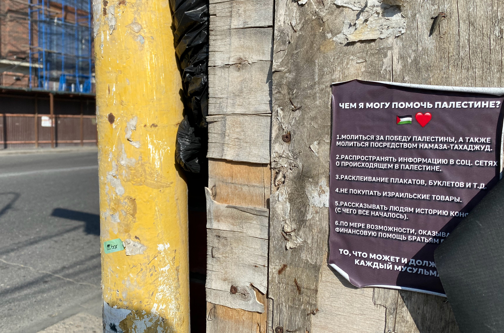 On the morning of the rally, anti-Israeli stickers and posters appeared in Makhachkala, calling to boycott Israeli products, not to rent apartments or houses to “Jewish refugees,” and to refuse them service in restaurants and taxis. “All of you are witnesses to how Palestine has sheltered them and the gratitude it has received,” said a publication on a now-blocked Telegram channel. “Today Palestinian children are dying at their hands, and tomorrow it could affect our people.”