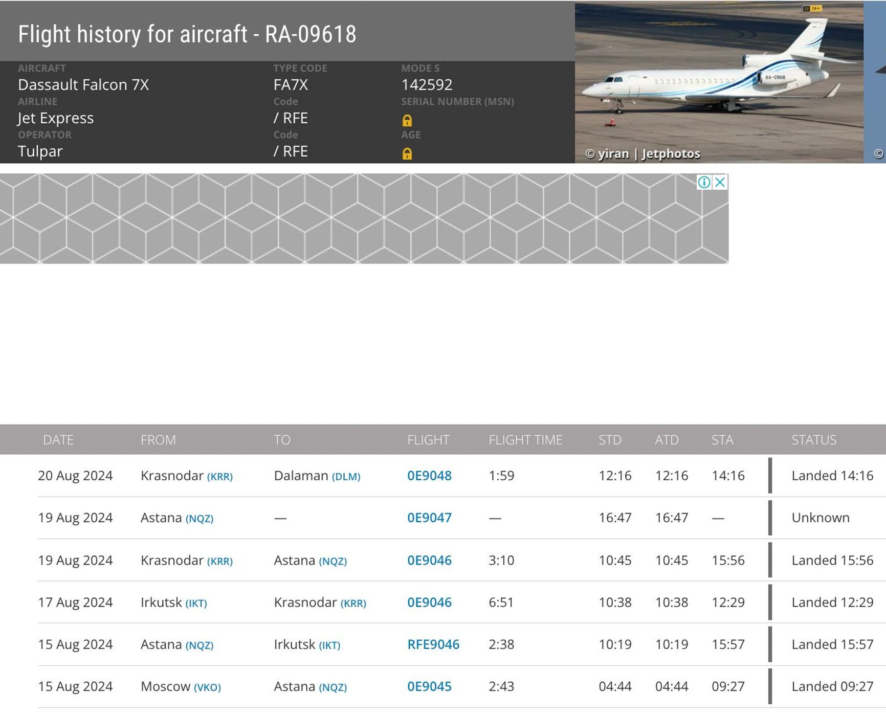 Dassault Falcon business jets are manufactured in France and are favored by both Alexei Miller and oligarch Oleg Deripaska — a metals tycoon that founded the major aluminum producer Rusal. In August, the jet assigned to Deripaska, bearing the tail number RA-09618, visited Thailand, India, Turkey, and Kazakhstan.