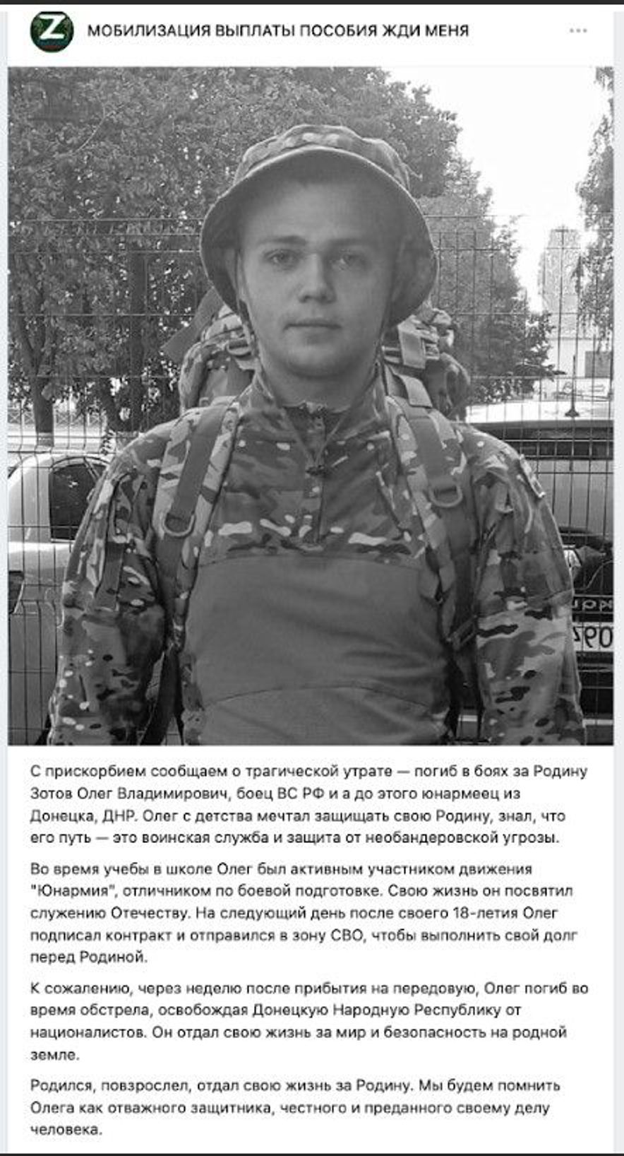 “Oleg dreamed of defending his Motherland since childhood and knew that his path was military service and protection against the neo-Banderite threat,” reads part of the obituary for Oleg Zotov, who signed a contract with the Russian Armed Forces on his eighteenth birthday and was sent to the frontline, where he was killed a week later. The young native of Donetsk may have been inspired to enlist by the Yunarmiya ( “Young Army”) youth patriotic movement, of which he was an active member.